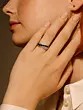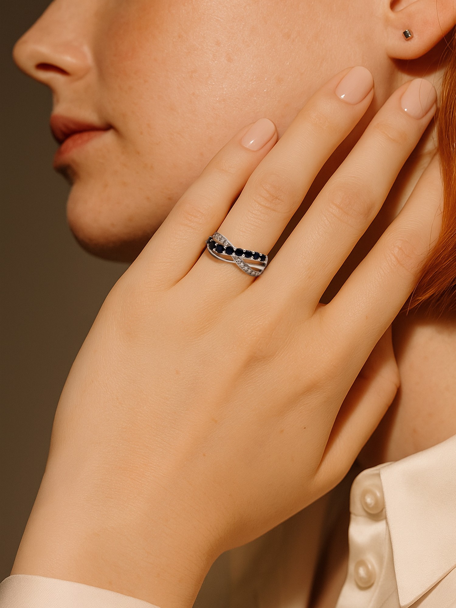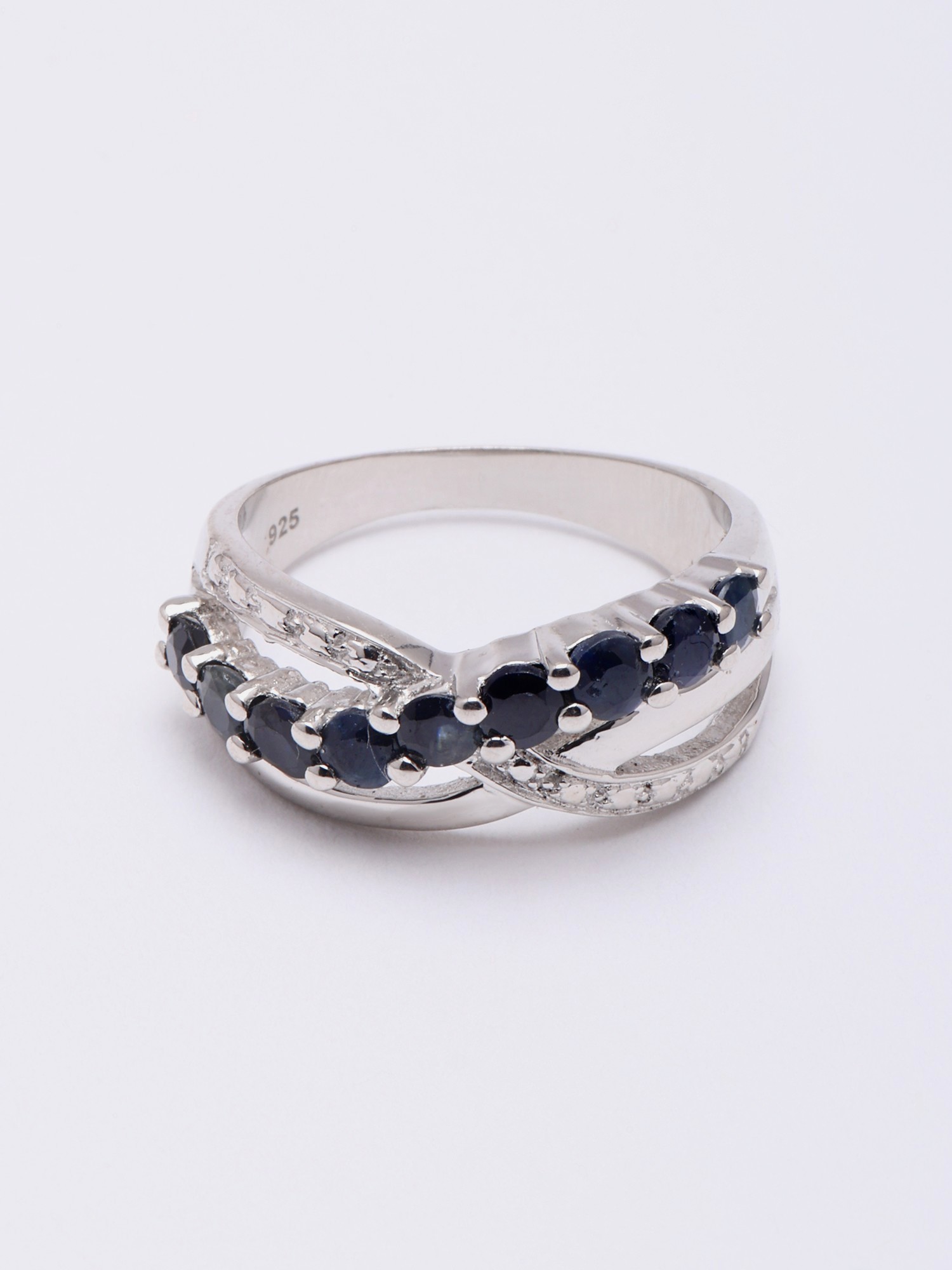 The row of faceted stones elevates the ring's allure, providing a striking contrast against the gleaming sterling silver. Each stone is carefully selected and set to maximize its sparkle and depth of color, creating a captivating focal point. The deep, rich hue of these stones evokes a sense of mystery and luxury, enhancing the overall visual appeal of the ring.