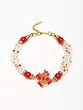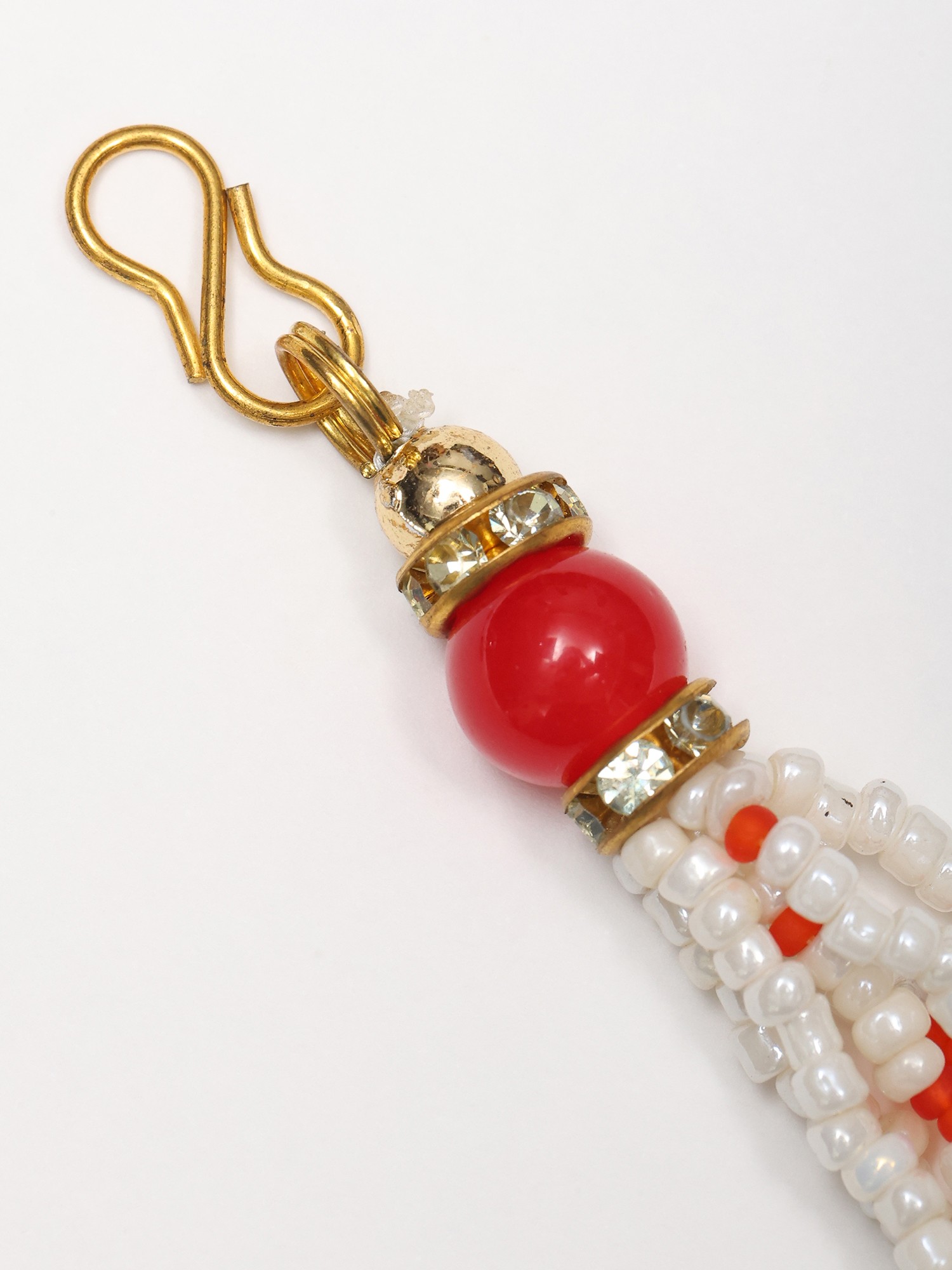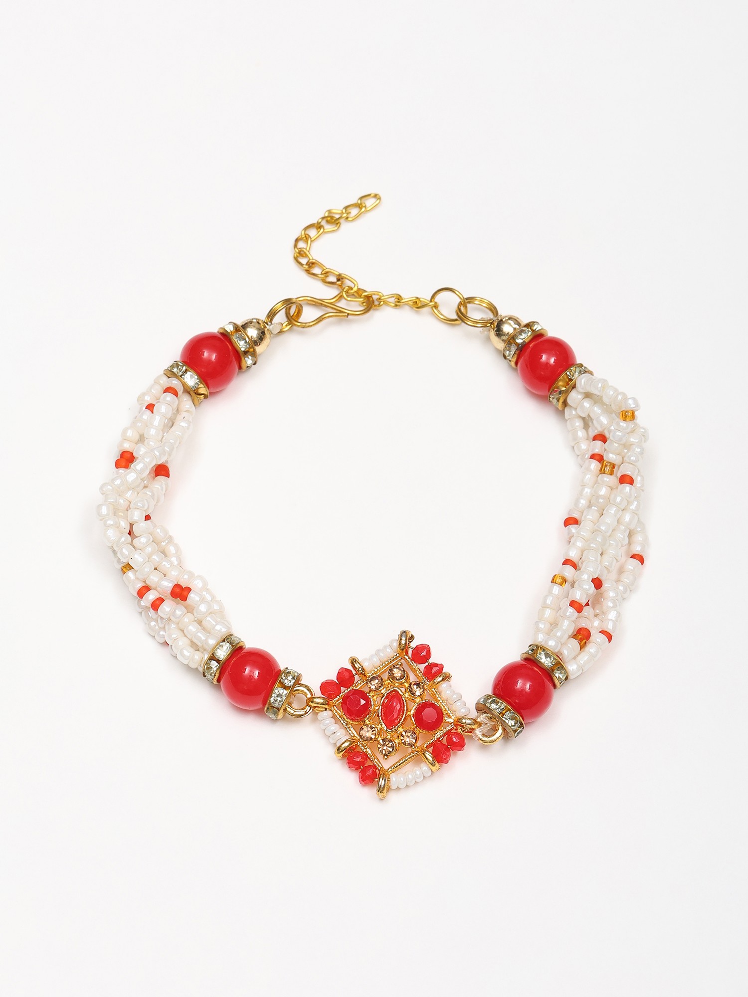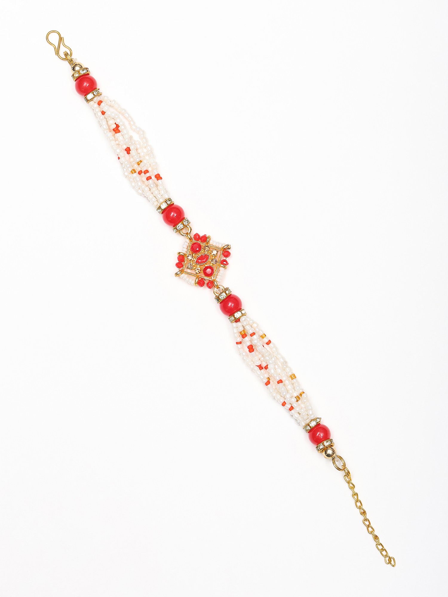 The centerpiece of this beautiful bracelet is a diamond-shaped emblem adorned with meticulously studded stones and beads. The vibrant colors and intricate detailing catch the eye and add a touch of regal charm. The central design is bordered by delicate beadwork, creating a harmonious blend of textures and tones. The bracelet features a multi-strand design of seed beads in a pristine white shade, interspersed with subtle dashes of orange. The beads are held together with larger, round beads, embellished with intricate detailing for a regal touch. The use of high-quality materials ensures durability and a radiant finish. The metalwork is crafted with precision, showcasing the attention to detail that goes into each piece.