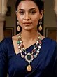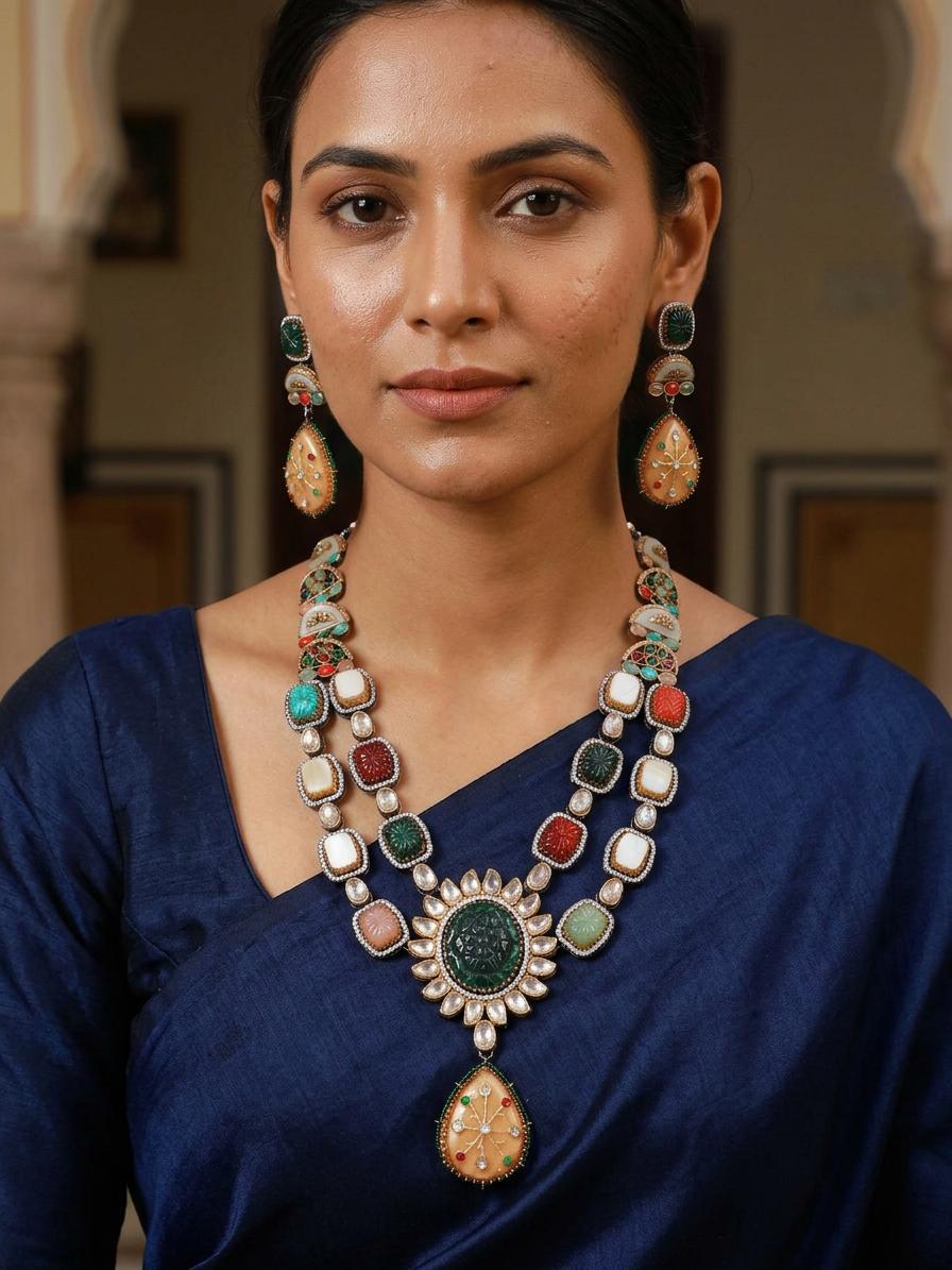 Immerse yourself in the rich tapestry of Indian artistry with this exquisite double-layer necklace set. Handcrafted with meticulous detail, this piece is a testament to the enduring legacy of traditional craftsmanship, reimagined for the modern woman. The necklace's cascading layers are adorned with a symphony of vibrant colors and intricately carved details, creating a mesmerizing visual spectacle that commands attention. Each meticulously placed stone, carefully selected for its brilliance and hue, contributes to the overall luxurious feel. The necklace’s centerpiece is a stunning, large, carved stone pendant, further enhancing its regal appeal. The design elegantly balances boldness and sophistication, making it the perfect statement piece for any occasion.