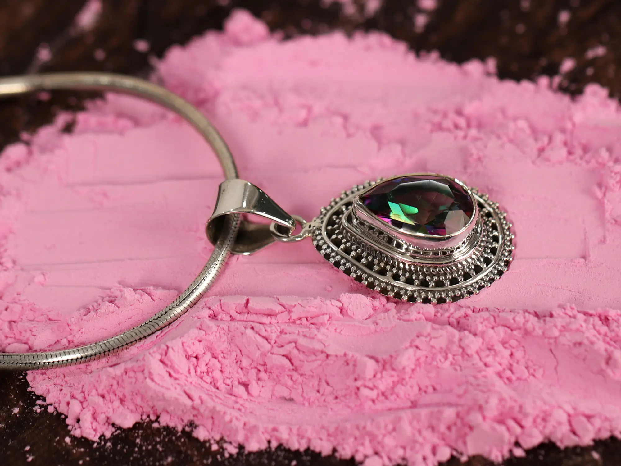 This stunning pendant measures 1.12 inches in height and 0.75 inches in width. To keep your pendant looking its best, we recommend storing it in a soft cloth pouch or jewelry box when not in wear. Avoid contact with harsh chemicals and clean it gently with a soft cloth when necessary. With proper care, your mystic topaz pendant will remain a cherished piece of your jewelry collection for years to come.