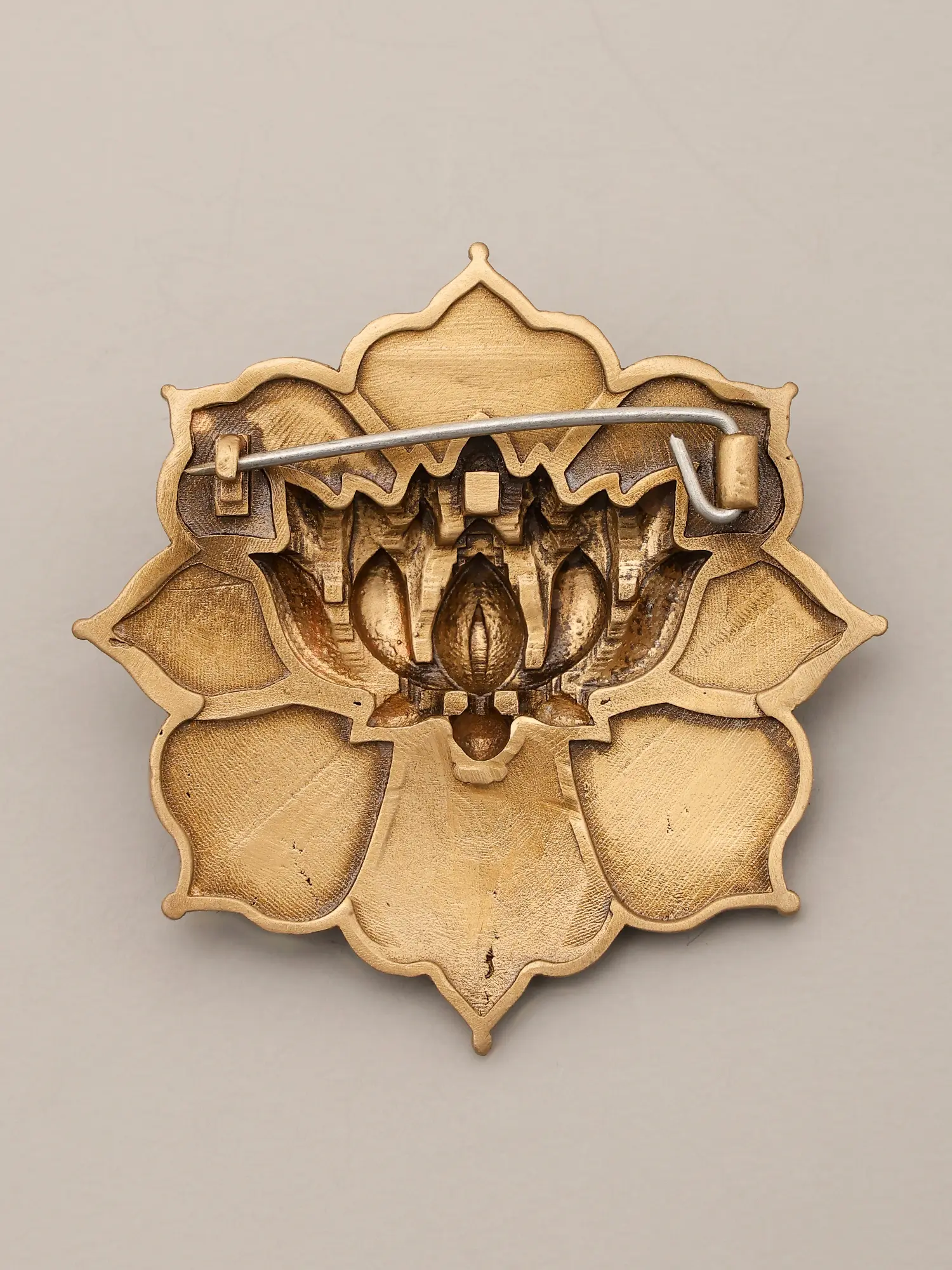 Every detail of this brooch has been thoughtfully considered, from the gracefully curved petals of the lotus to the delicate filigree that surrounds it. The artisan's skill is evident in the intricate carvings, which create a mesmerizing texture and depth. The raised central petals of the lotus give it a striking three-dimensional appearance. Made of solid brass, this brooch is not only beautiful but also durable. Brass is known for its resistance to corrosion, ensuring that this piece will retain its luster and beauty for years to come. Its substantial feel is a testament to its quality, making it a truly cherished heirloom.