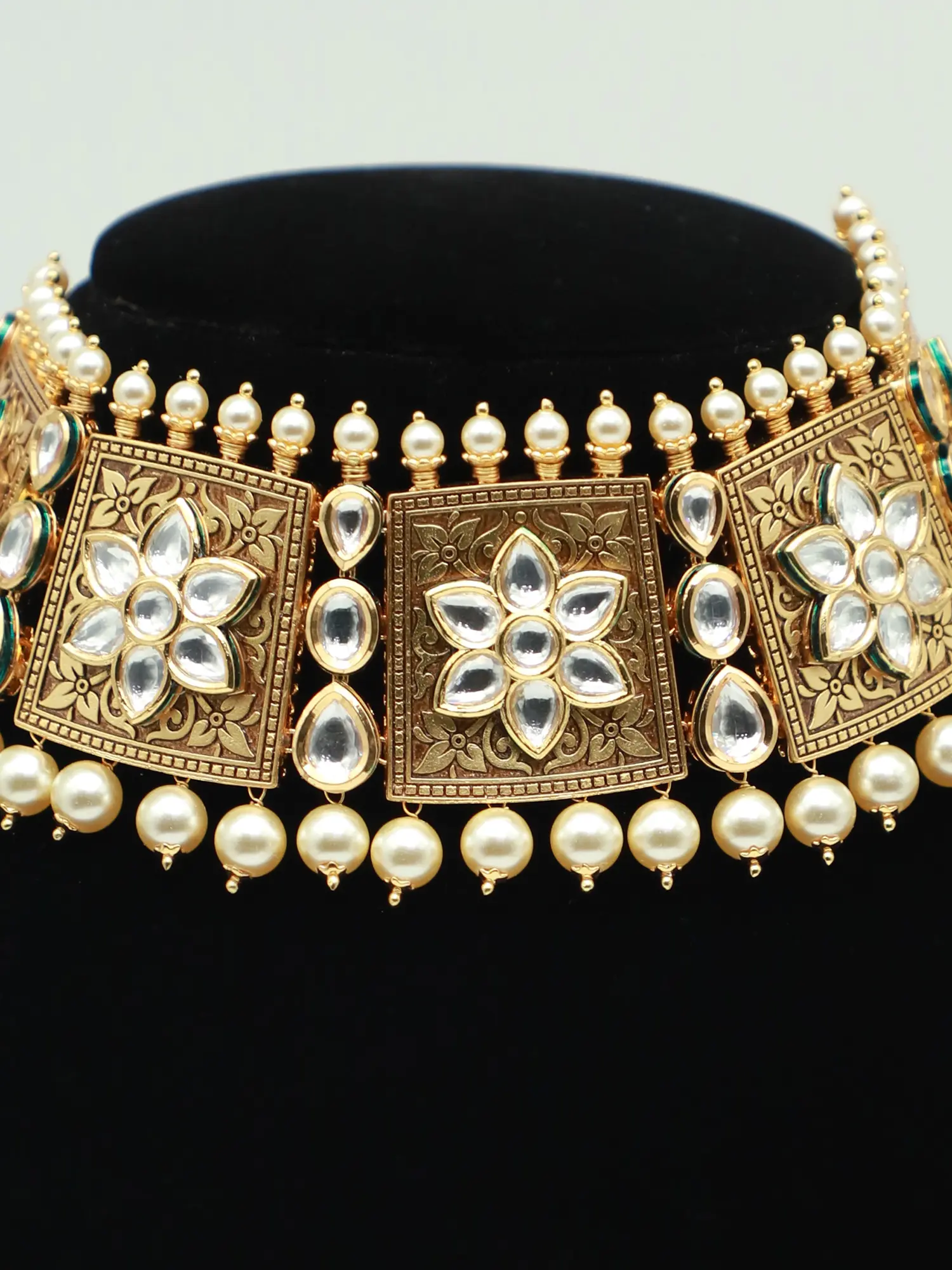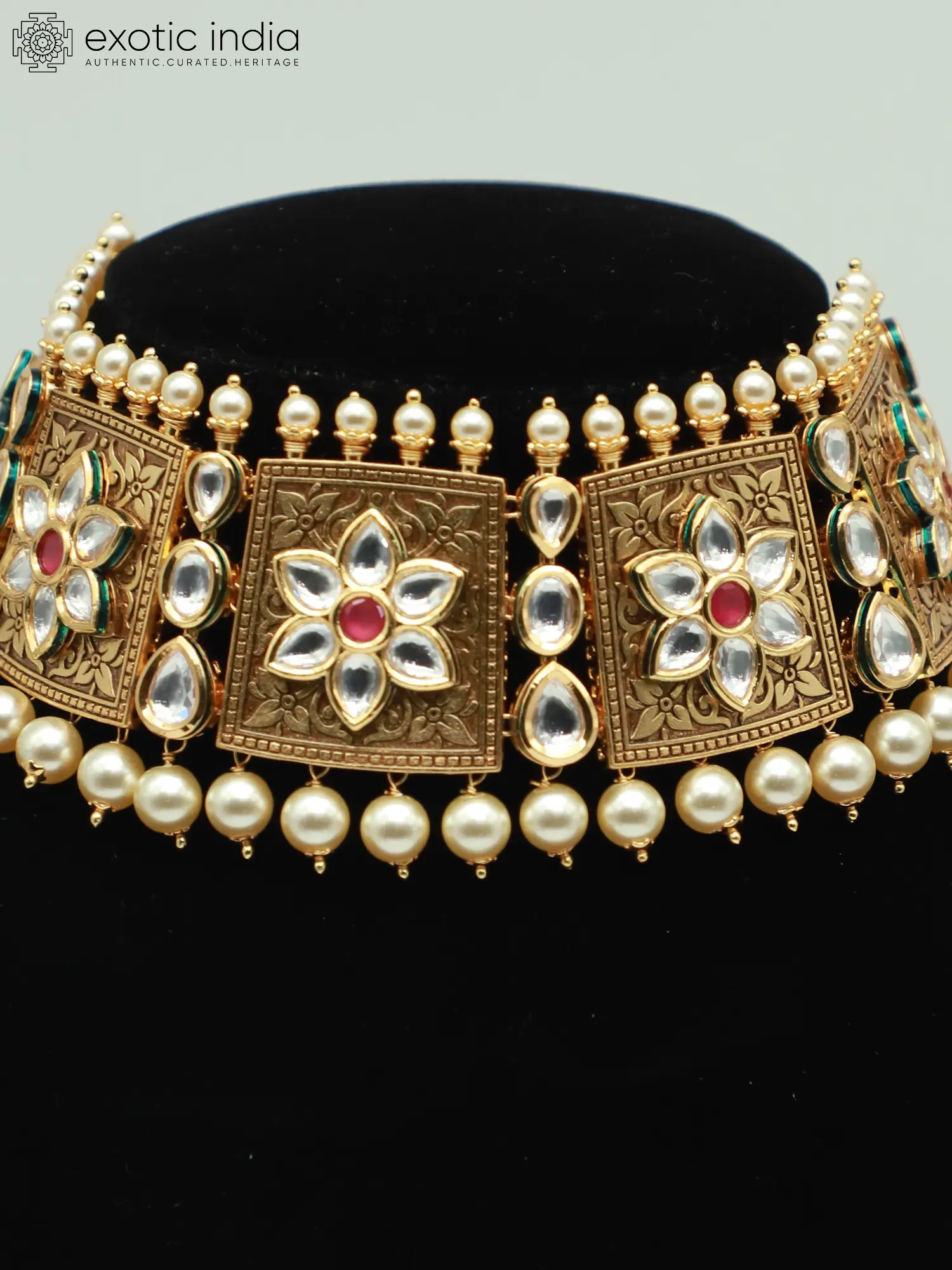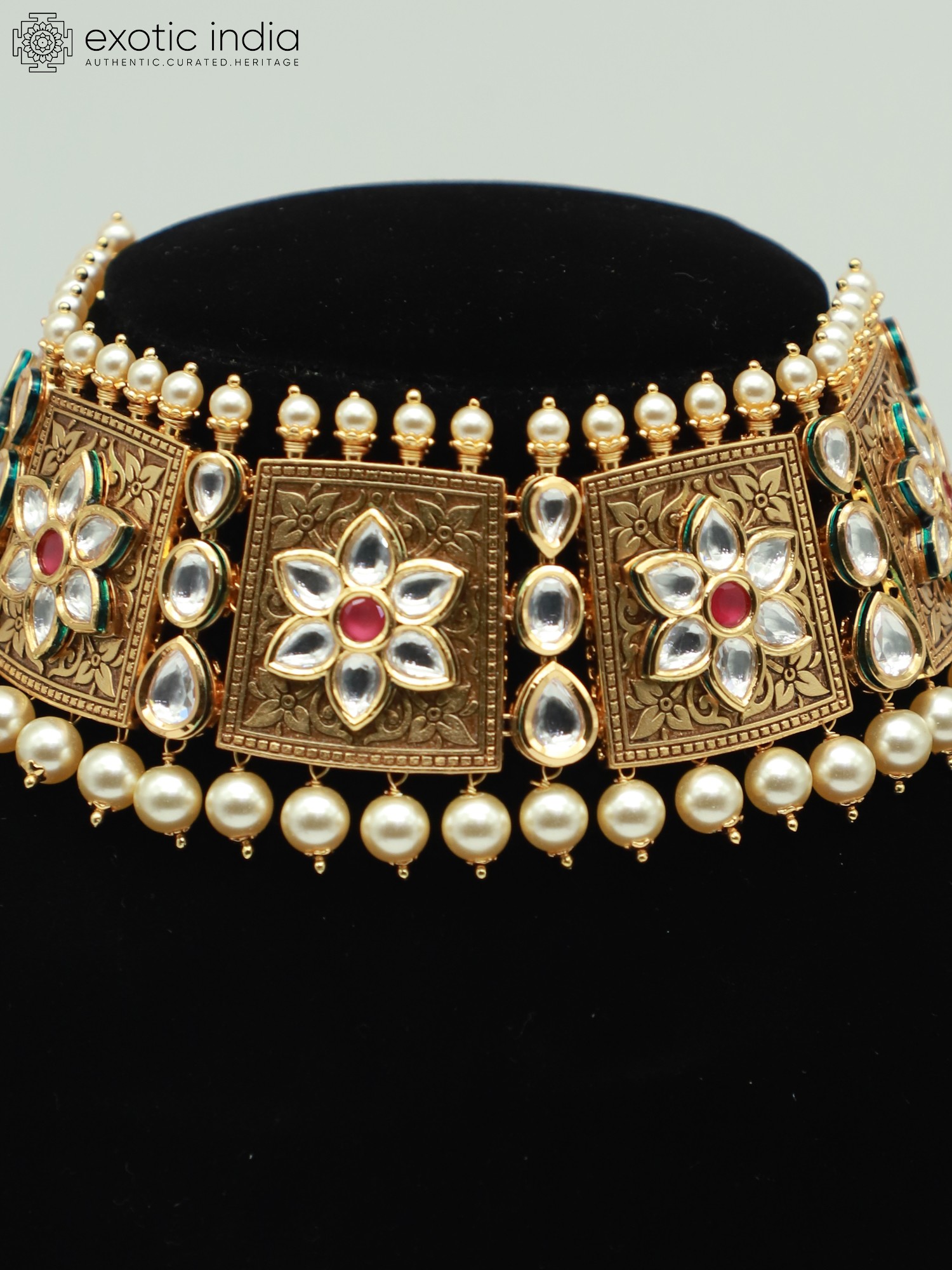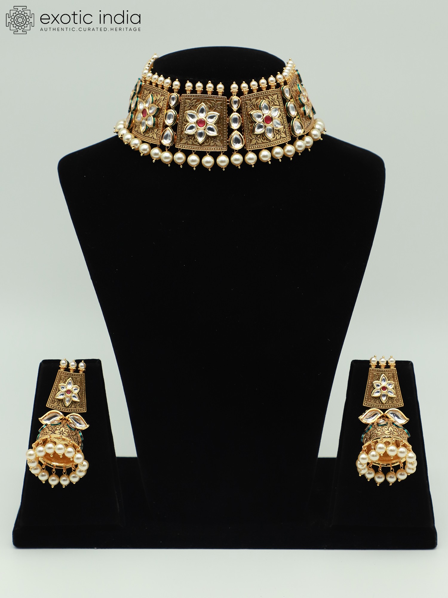 Rajwadi Design Choker Necklace Set With Beautiful Carving Earrings And Hanging Beads