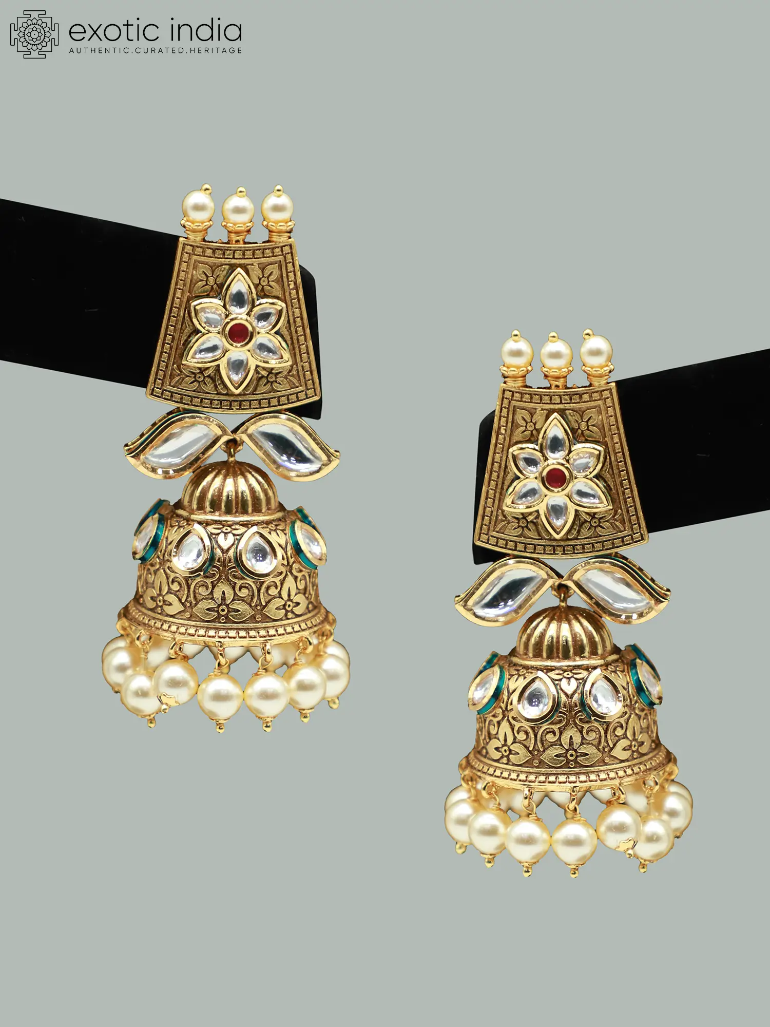 Brass Necklace Set With Kundan Studded Earrings And Hanging Beads