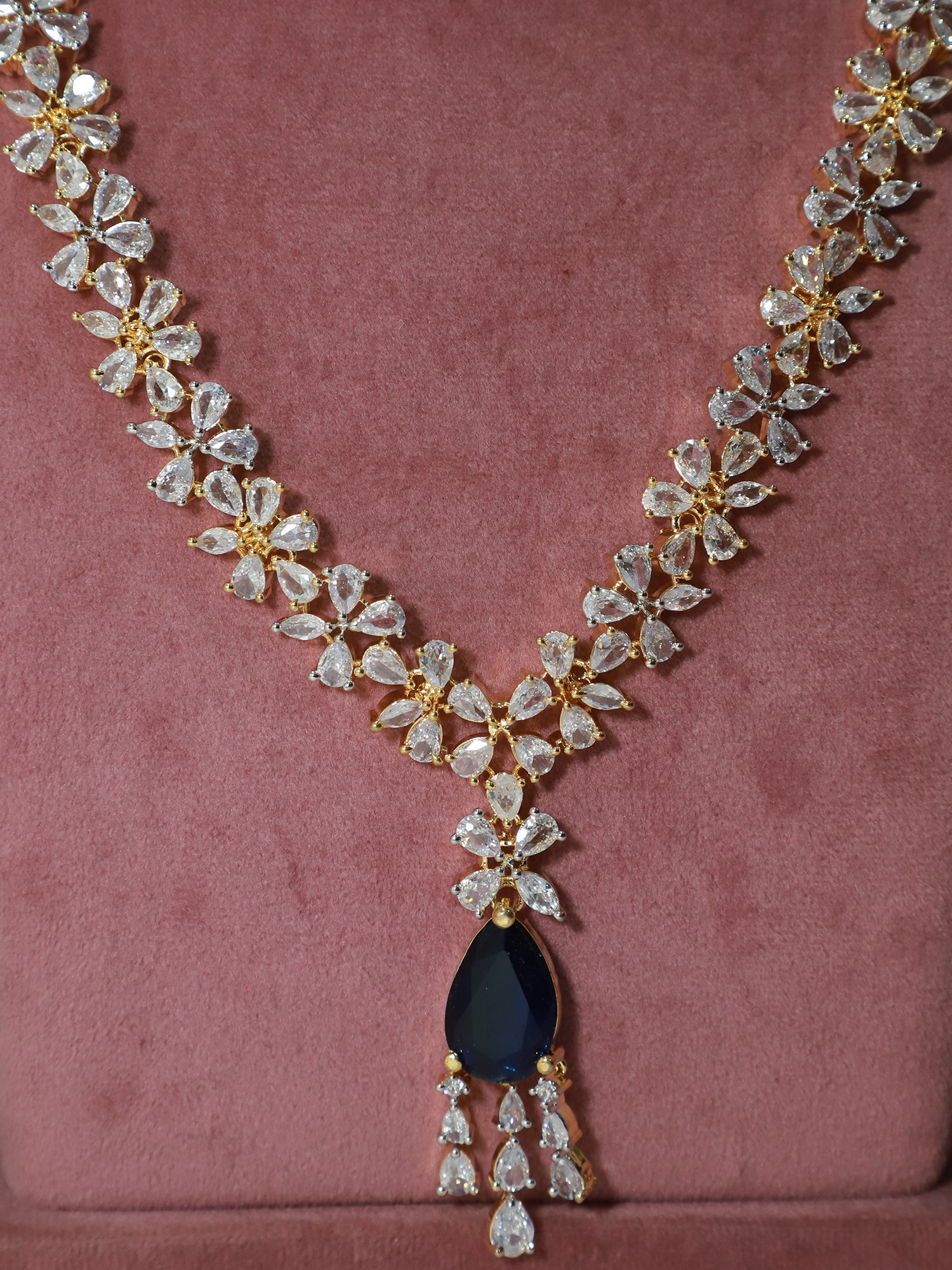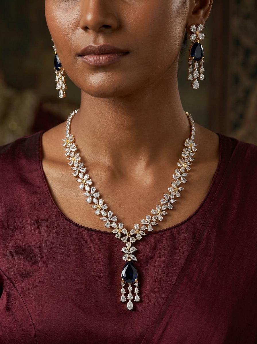 This exquisite necklace and earrings set is a celebration of delicate beauty and timeless elegance. Designed for the discerning woman who appreciates sophisticated accessories, this set will add a touch of glamour to any outfit. The intricate floral motif is carefully crafted with dazzling American Diamonds, creating a shimmering display of light and sparkle. The necklace boasts a graceful design featuring a string of petite floral elements. Each "petal" is adorned with brilliantly cut American Diamonds, set to catch the light and create a radiant effect. The chain itself is meticulously constructed, ensuring a comfortable and secure fit.