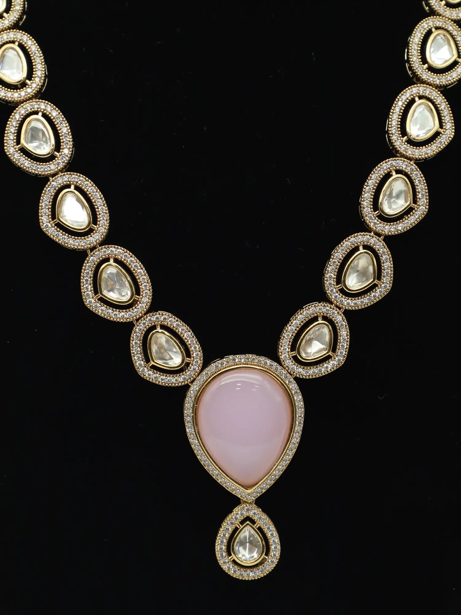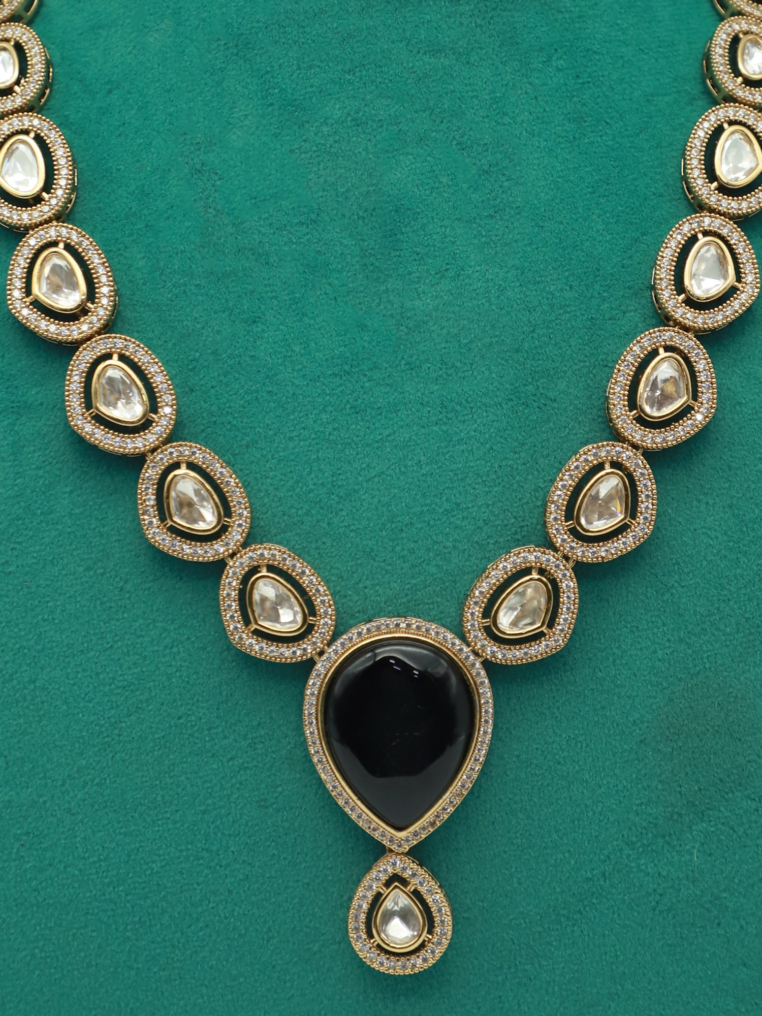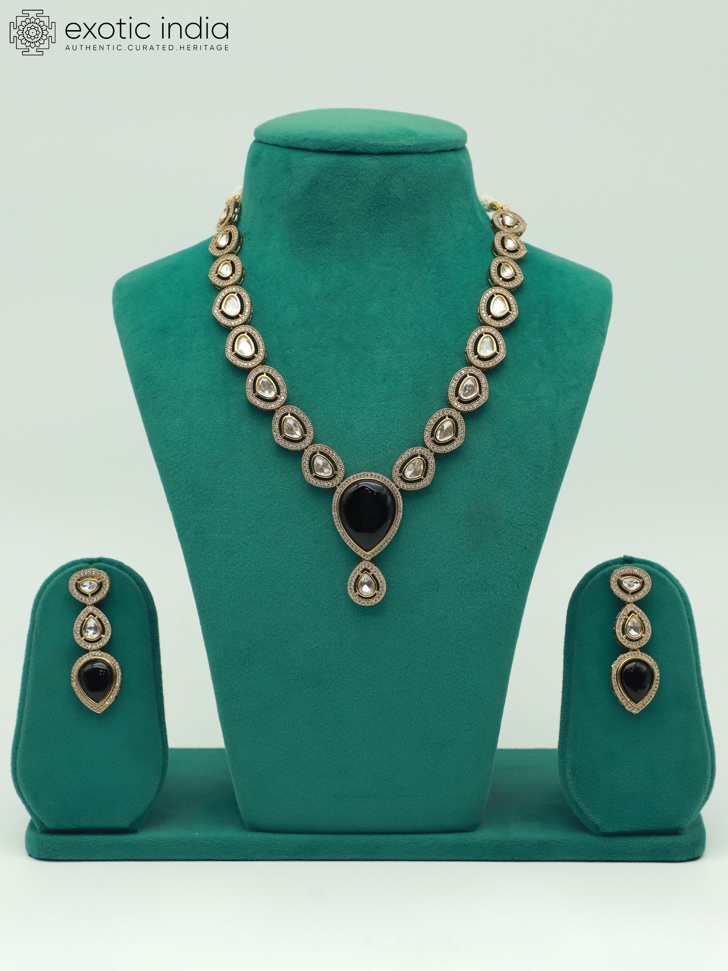 Whether you're dressing up for a formal event or adding a touch of glamour to your everyday look, this necklace and earrings set is the perfect choice. Its timeless design and sophisticated aesthetic make it a versatile addition to any wardrobe. Pair it with a traditional sari or lehenga for a classic Indian look, or wear it with a cocktail dress or evening gown for a touch of modern elegance. The subtle sparkle of the moissanite kundan stones adds a touch of glamour without being overwhelming, making it suitable for a wide range of occasions. Its refined elegance will surely captivate and turn heads. Let it be the centerpiece of your outfit or complement other favorite accessories. This set is more than just jewelry; it's a reflection of your personal style and impeccable taste.