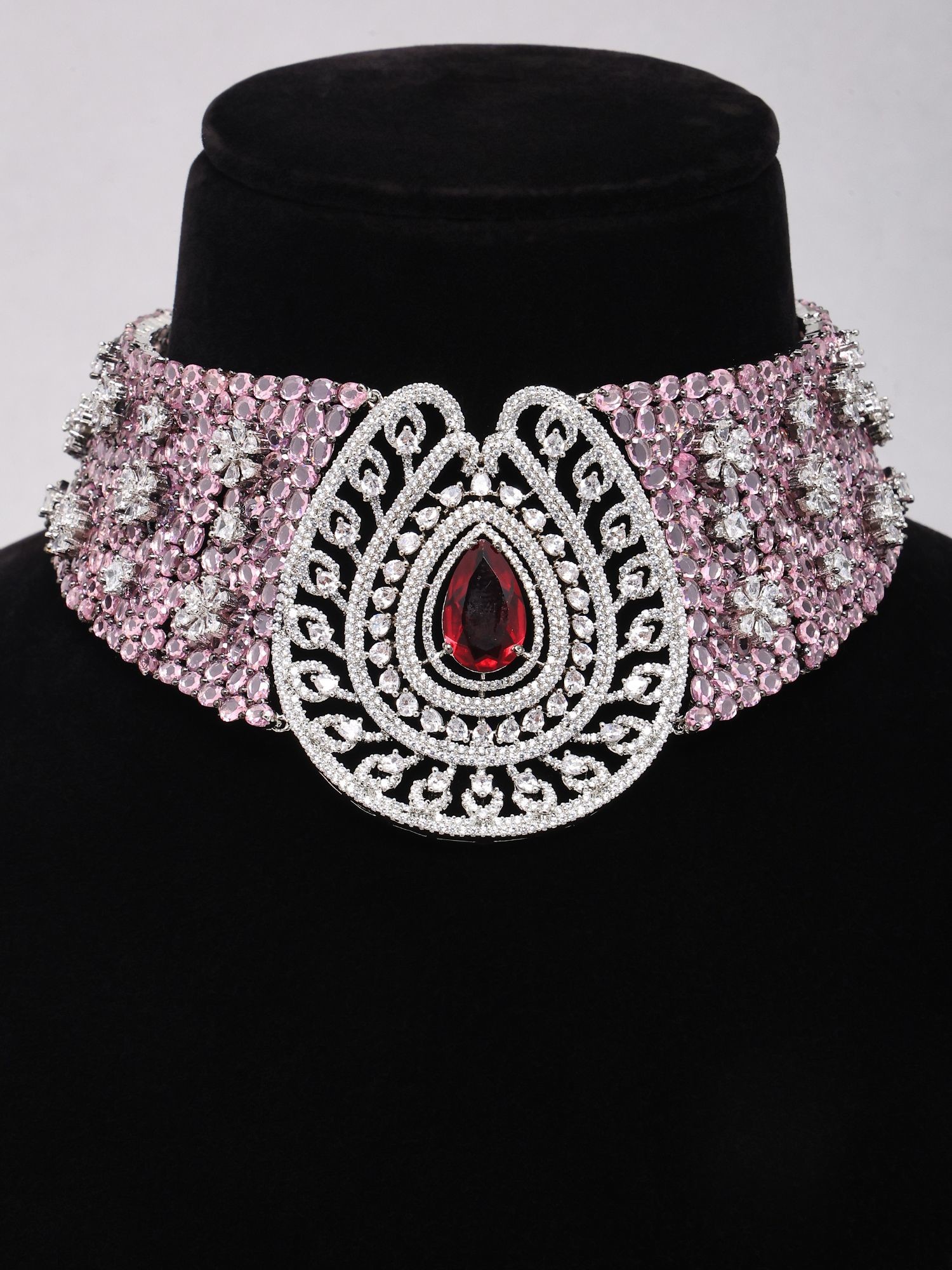 • Features a striking pink American diamond centerpiece.