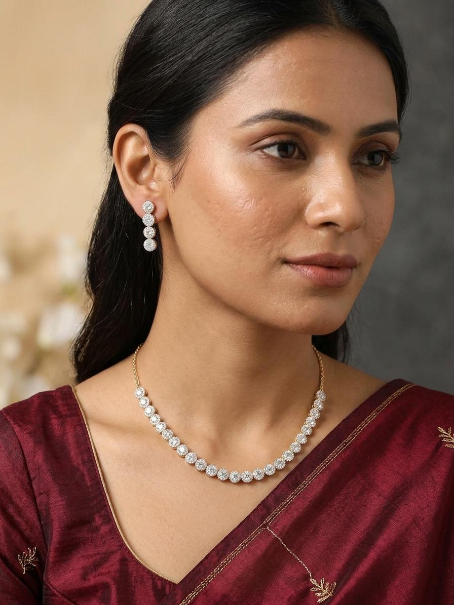 This set has been created with attention to detail and quality. The American Diamonds offer exceptional brilliance. The setting is expertly crafted, ensuring durability and long-lasting wear. This ensures your jewelry maintains its captivating allure for years to come.