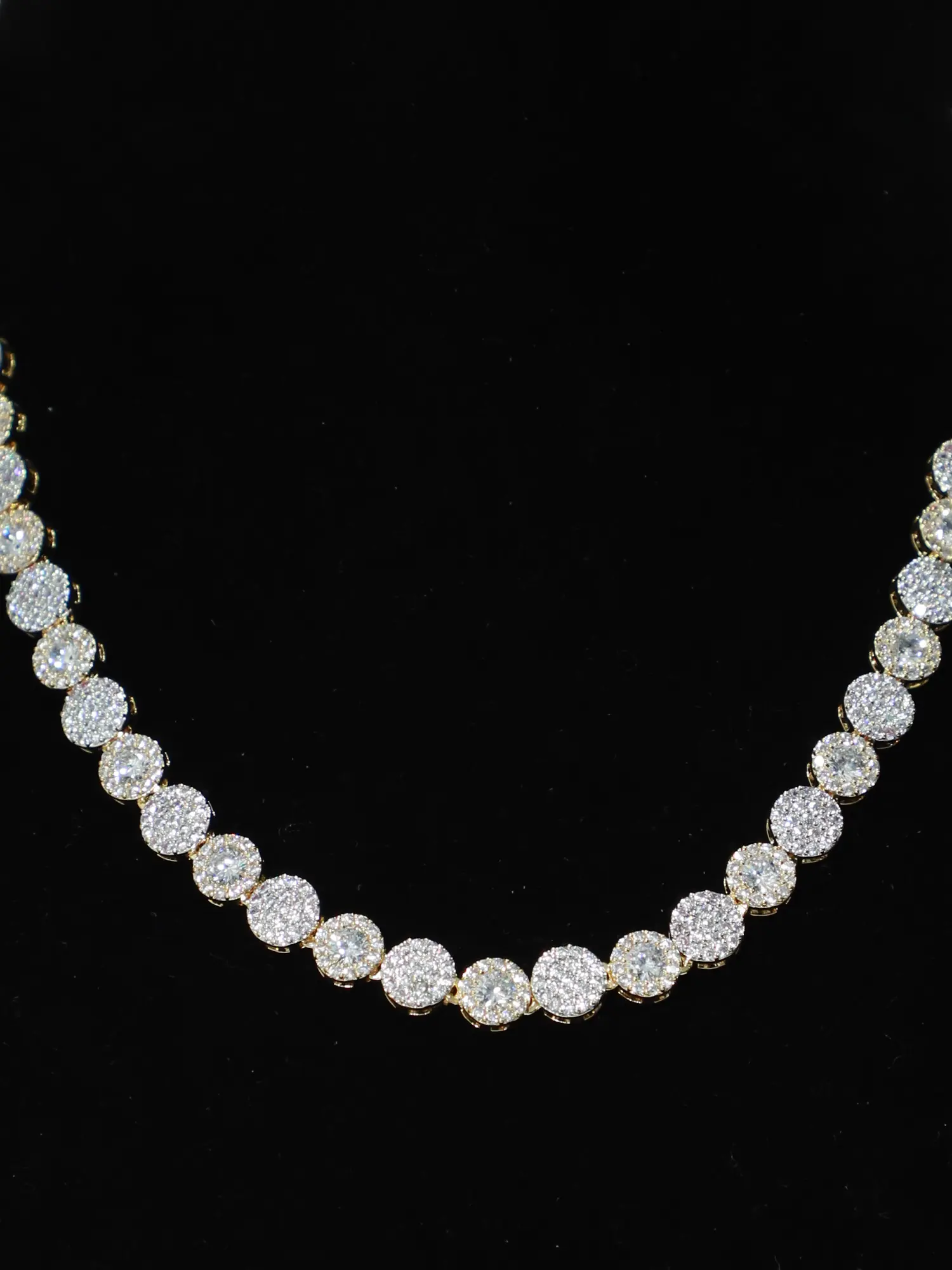 The focal point of this set lies in its meticulous construction and the brilliant sparkle of its round stones. Each stone has been carefully chosen and arranged to maximize its radiance, creating a dazzling effect that catches the light from every angle. The necklace features a delicate chain that gracefully drapes around the neck, showcasing a continuous line of sparkling stones. The earrings mirror this design, featuring a vertical arrangement of stones that dangle delicately, adding movement and drawing attention to your face.