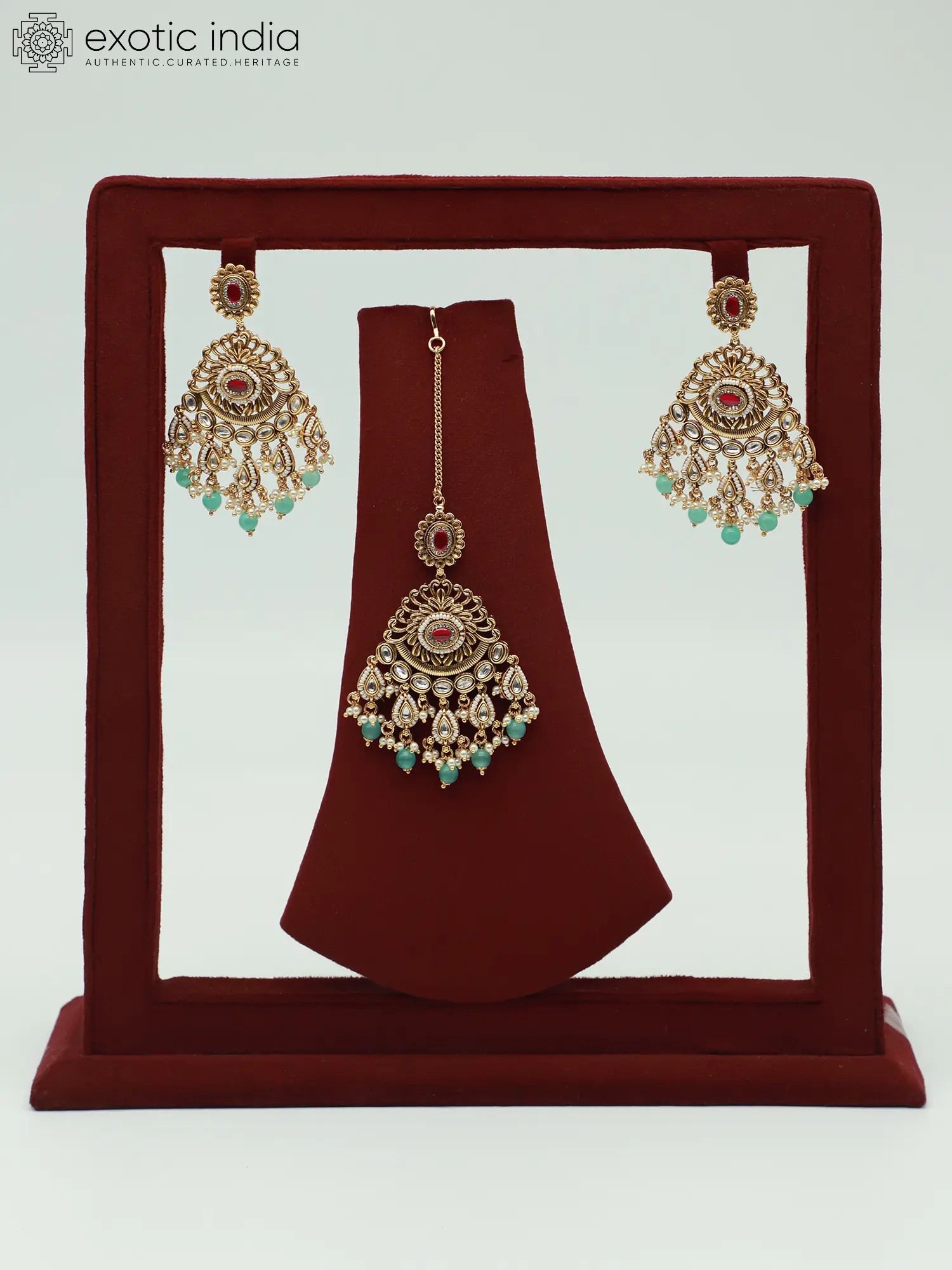 Embellished Stone Studded And Beaded Stunning Necklace With Earrings And Mangtika