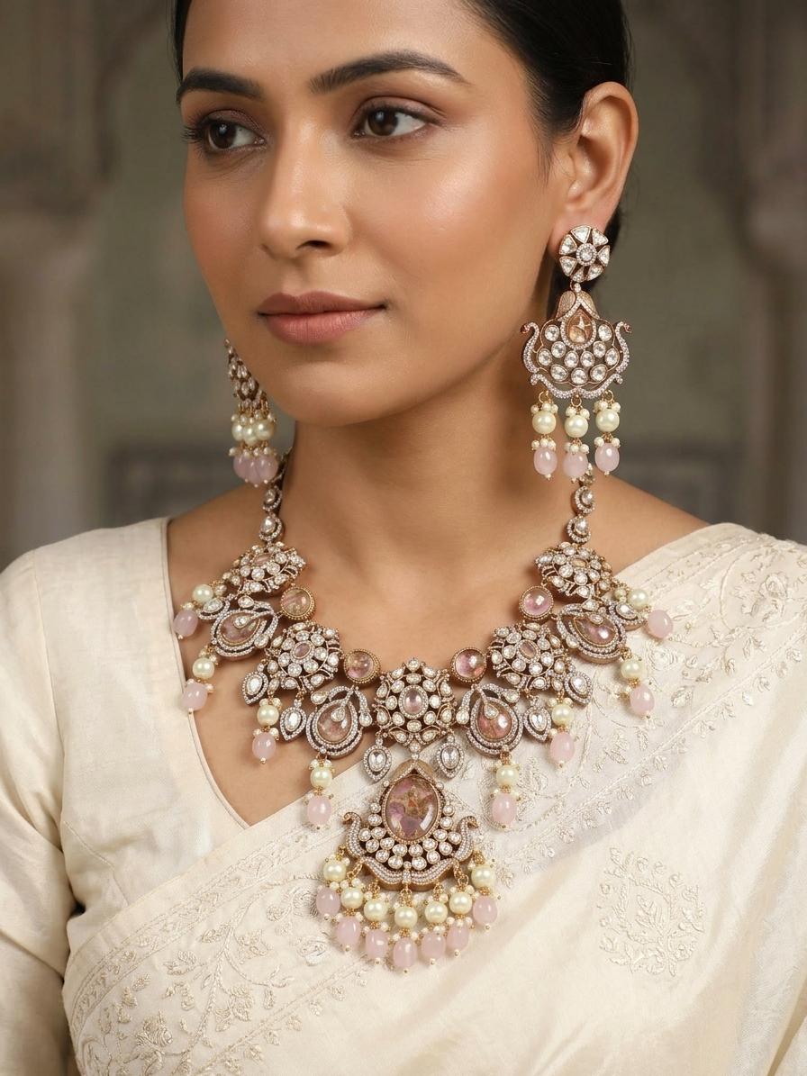 Victoria Polish Stone Studded Designer Necklace Set With Earrings