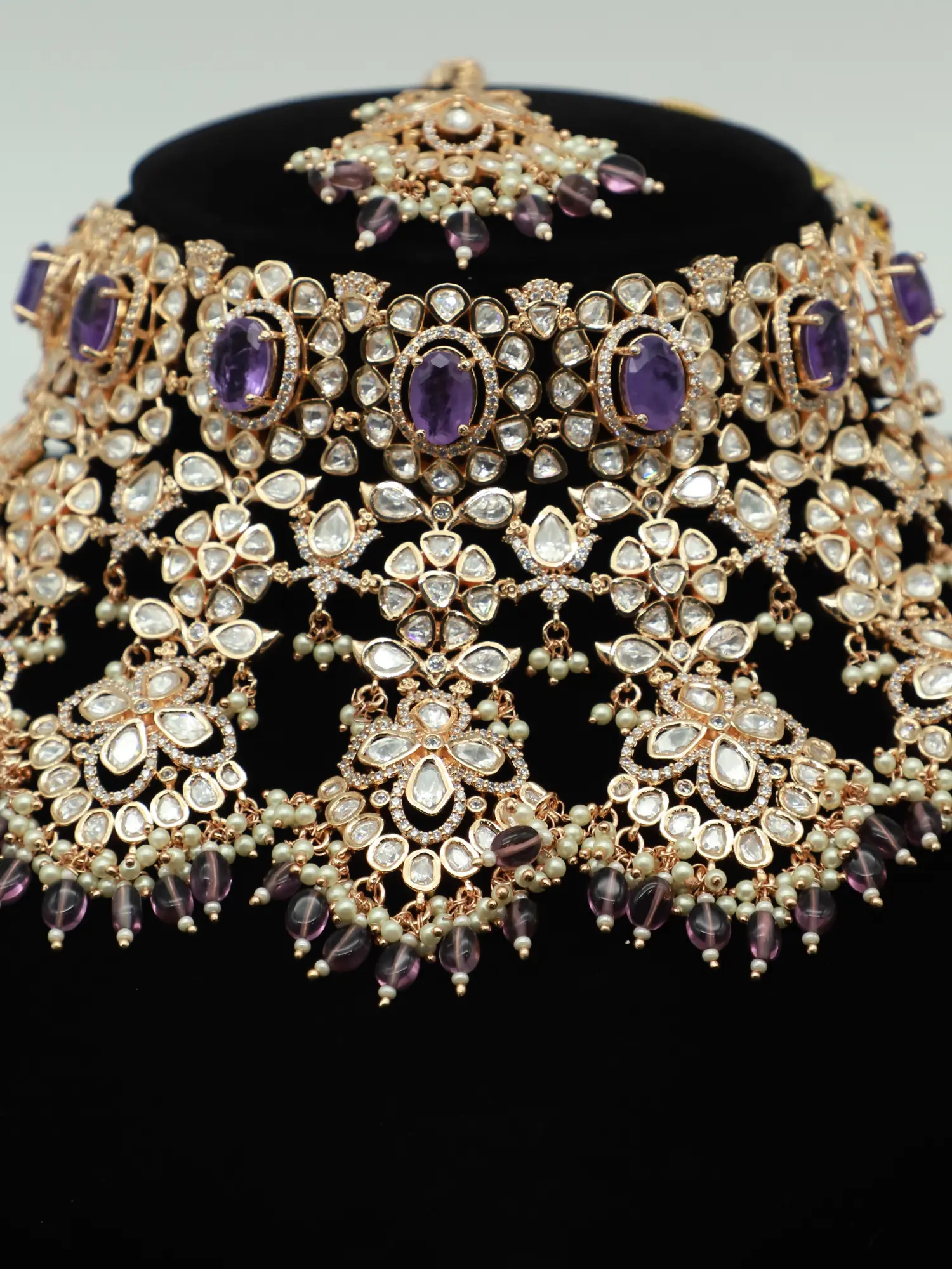 Stunning Stone Studded And Beaded Embellished Choker Necklace With Earrings And Mangtika