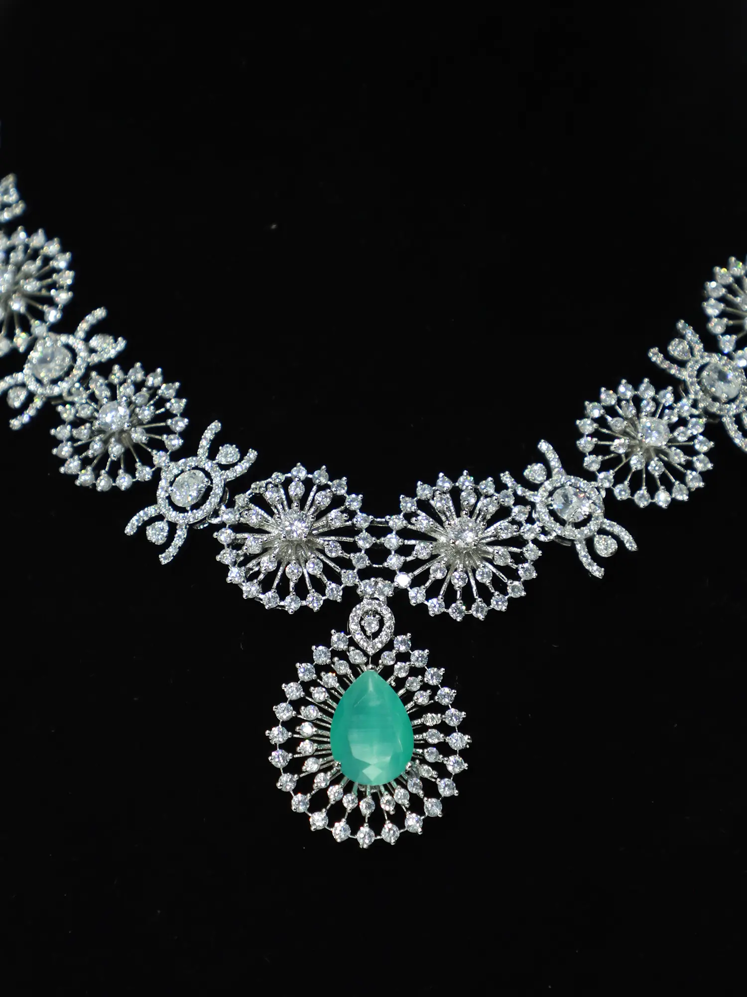 This necklace and earring set is crafted from high-quality materials designed for lasting beauty. The sturdy silver base ensures the set will withstand regular wear and tear. The secure settings of the American diamonds and sapphire prevent loss or damage, preserving the brilliance of the stones for years to come. Our commitment to quality extends to every aspect of the creation process, guaranteeing a piece you'll cherish for many years. This is a piece that speaks to enduring elegance, a timeless addition to your jewelry collection.