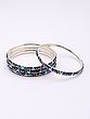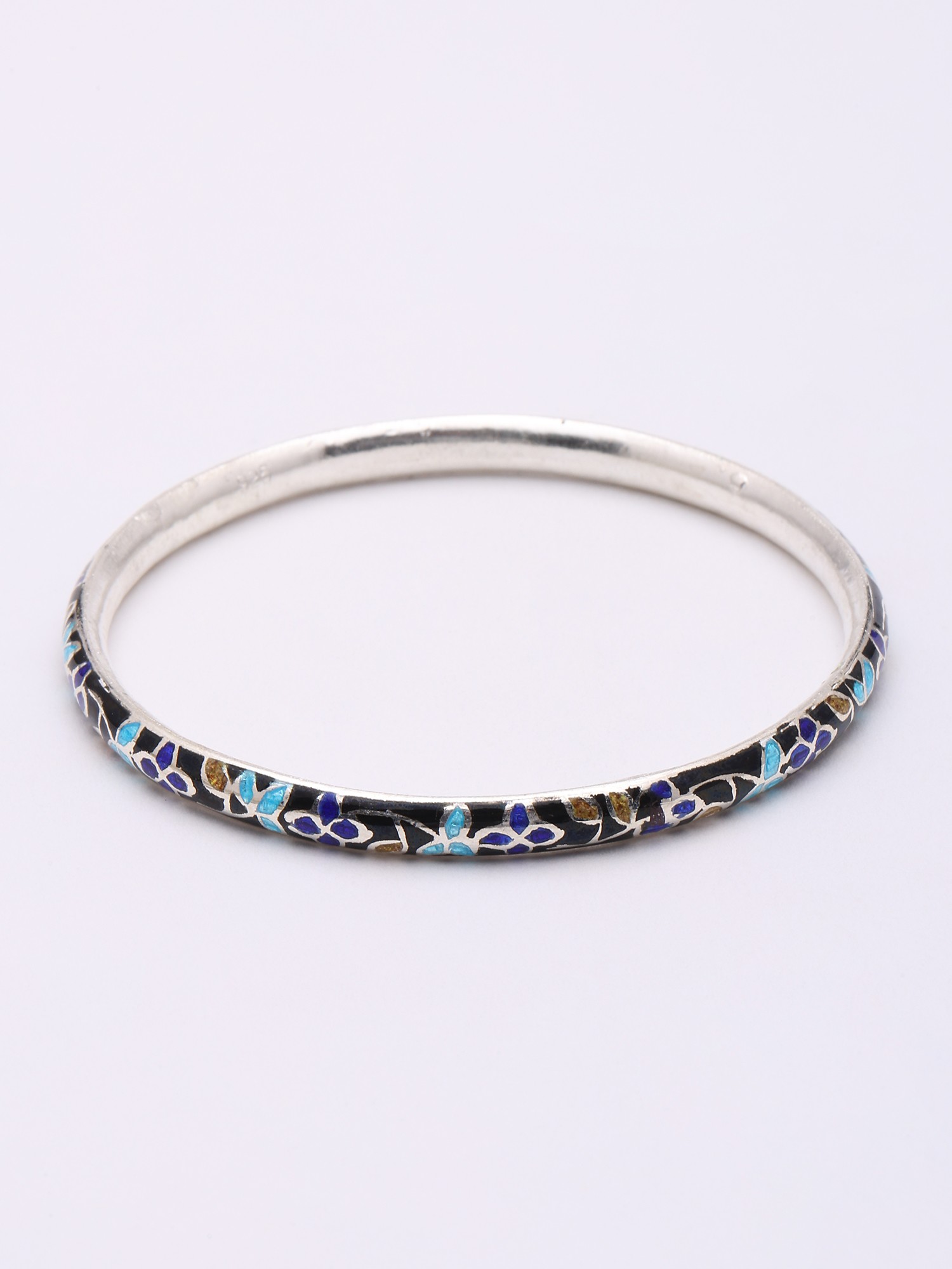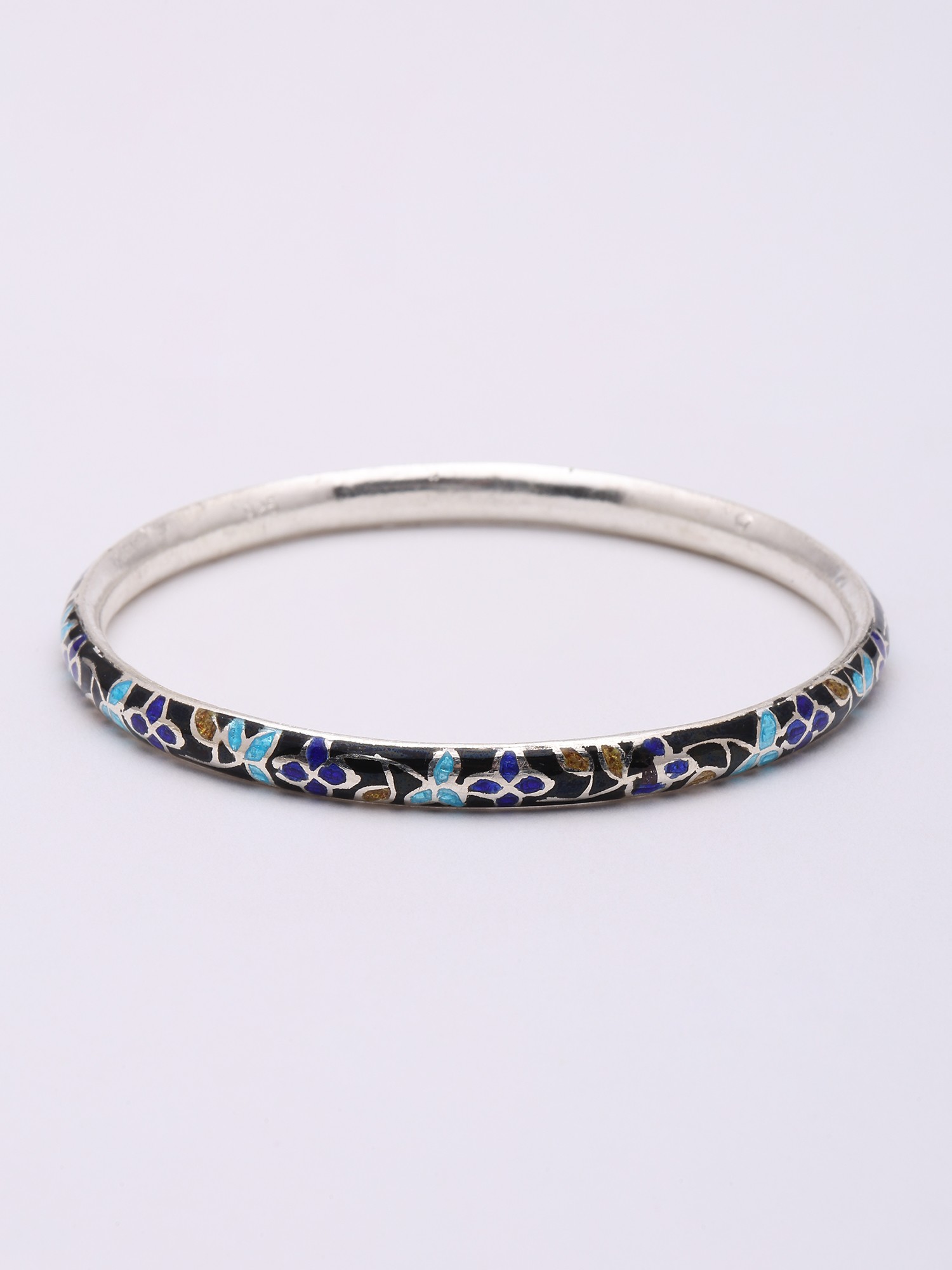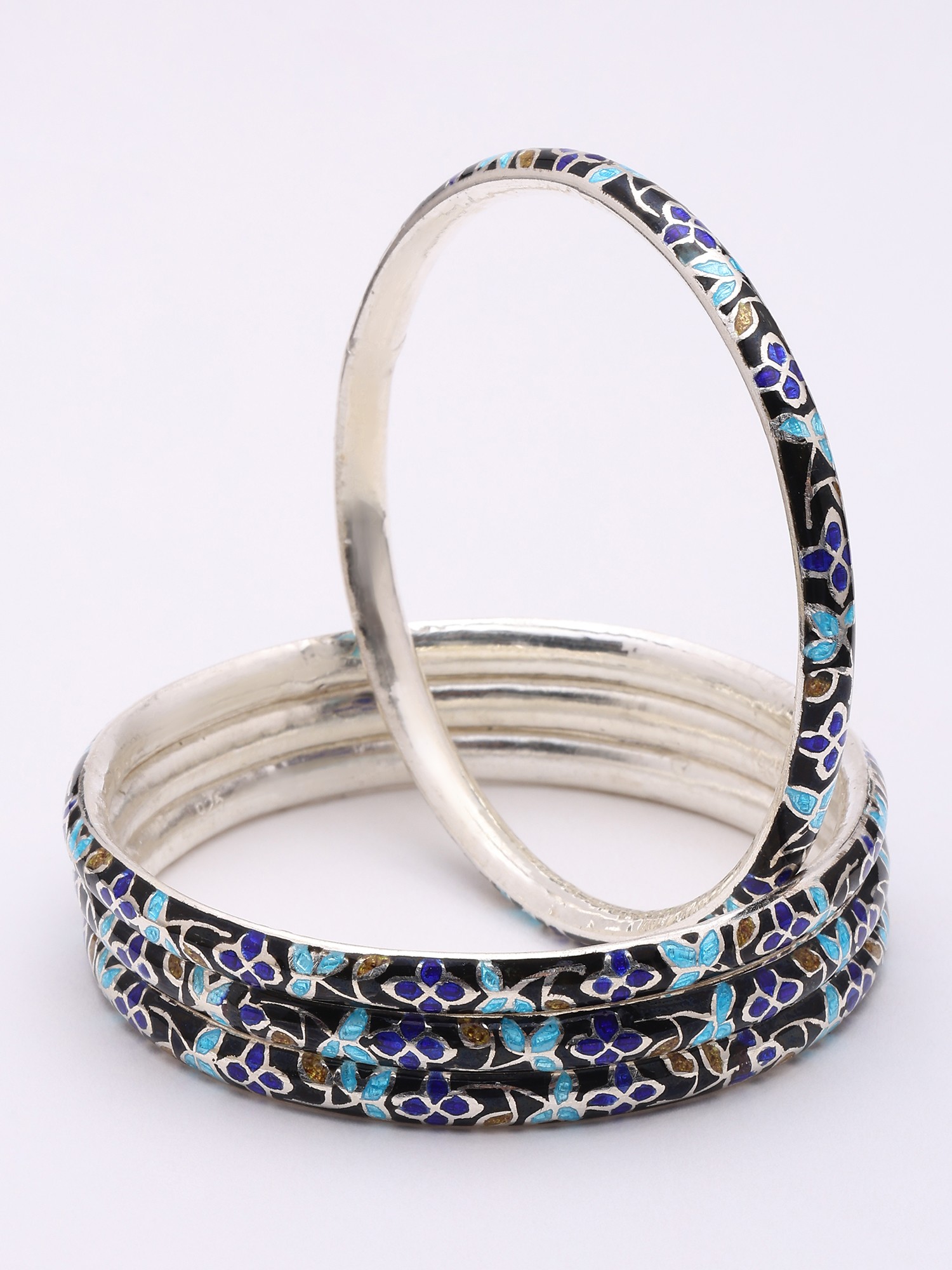 The true beauty of these bangles lies in their intricate enamel work. Each tiny flower is meticulously hand-painted in a vibrant palette of blues and tans, creating a striking contrast against the sleek silver backdrop. This careful attention to detail elevates these bangles from simple accessories to heirloom-quality pieces. The vibrant colors will not only complement your wardrobe but will also bring a touch of joy and whimsy to your day. The floral pattern is designed to evoke a sense of beauty and tranquility. The combination of delicate silver and vivid enamel brings a touch of luxury and sophistication to any ensemble.