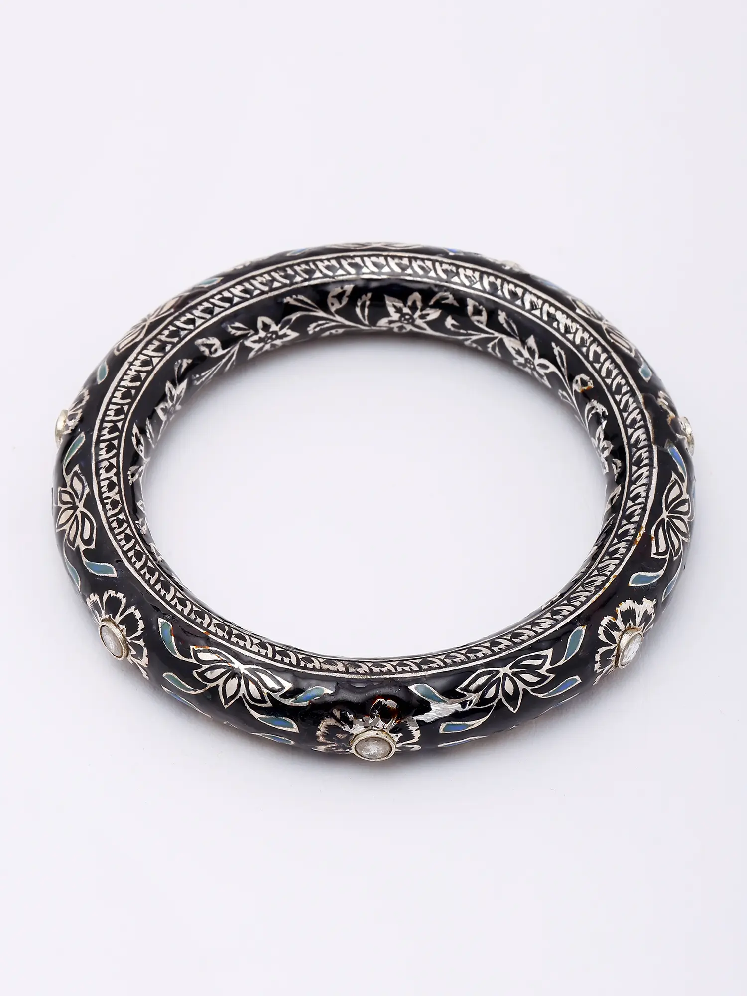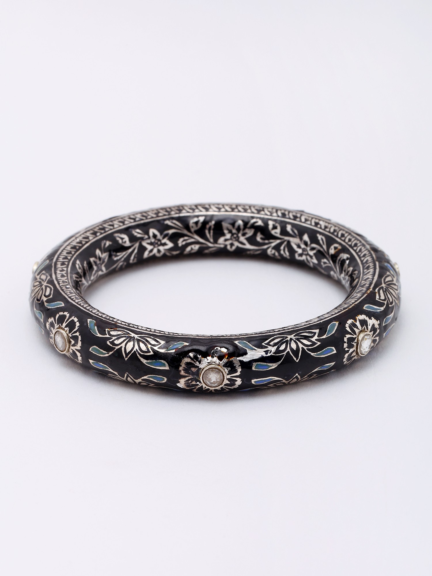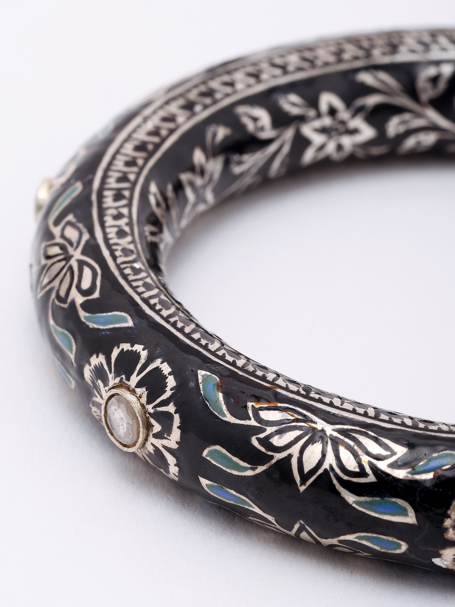 This bangle is more than just an accessory; it's a statement of refined taste and appreciation for fine jewelry. The contrasting black enamel and silver create a sophisticated visual appeal, making it a versatile addition to any jewelry collection. Whether you're dressing up for a special occasion or adding a touch of polish to your everyday style, this bangle effortlessly elevates your look. The smooth, polished finish ensures comfortable wear, while the detailed enamelling promises enduring beauty.