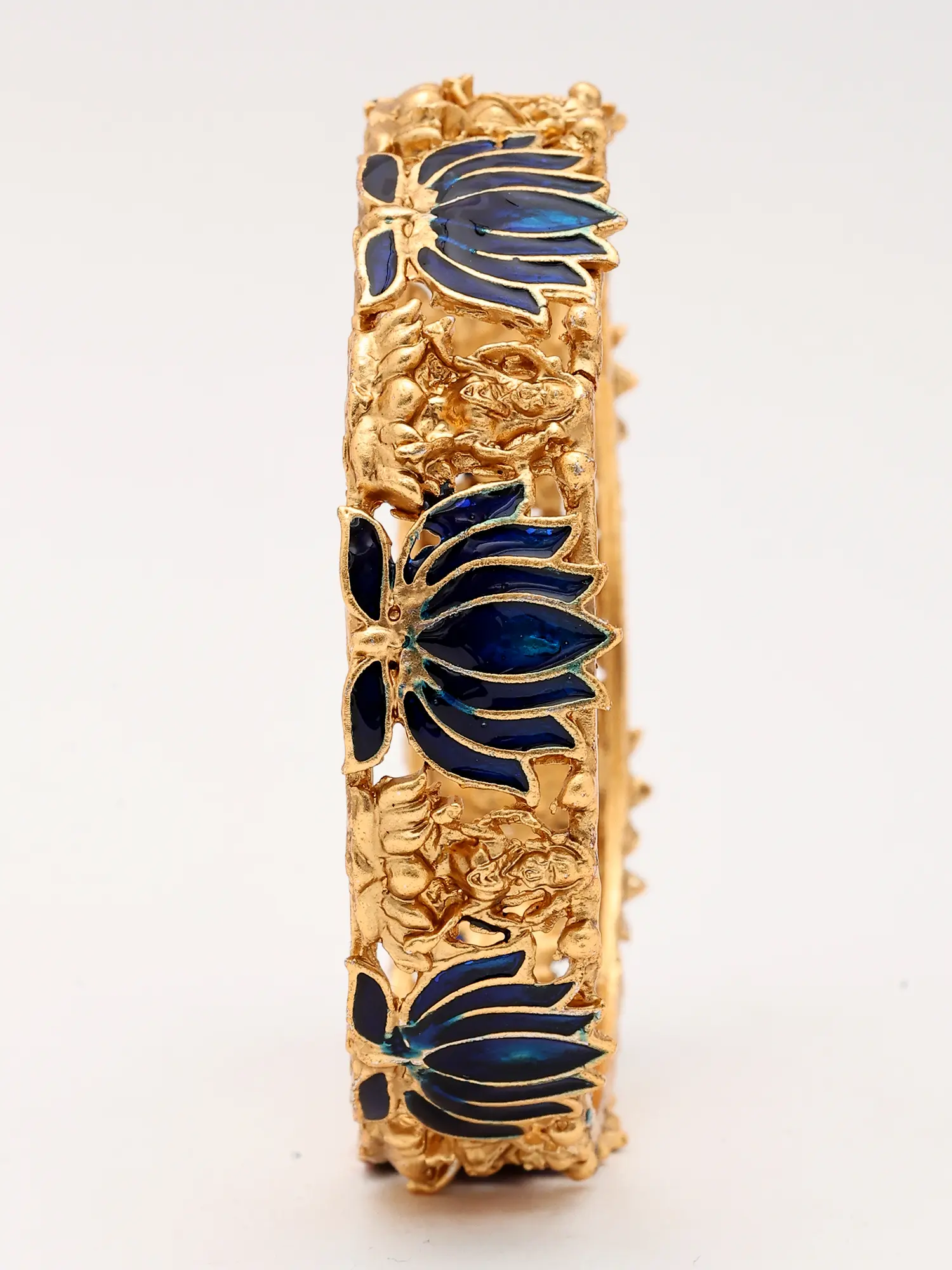 Each bangle is a testament to the artistry of skilled craftspeople. The antique gold finish is expertly applied to a durable brass base, providing a lustrous sheen that complements the rich, deep blue enamel work. The lotus motifs are rendered with delicate precision, their petals gracefully unfurling to reveal their inner beauty. Interspersed with these floral designs are delicate beadwork and textured patterns that add depth and dimension, creating a truly captivating visual appeal. The openwork design allows for a glimpse of the skin beneath, adding a subtle allure and ensuring the bangles remain light and comfortable to wear.