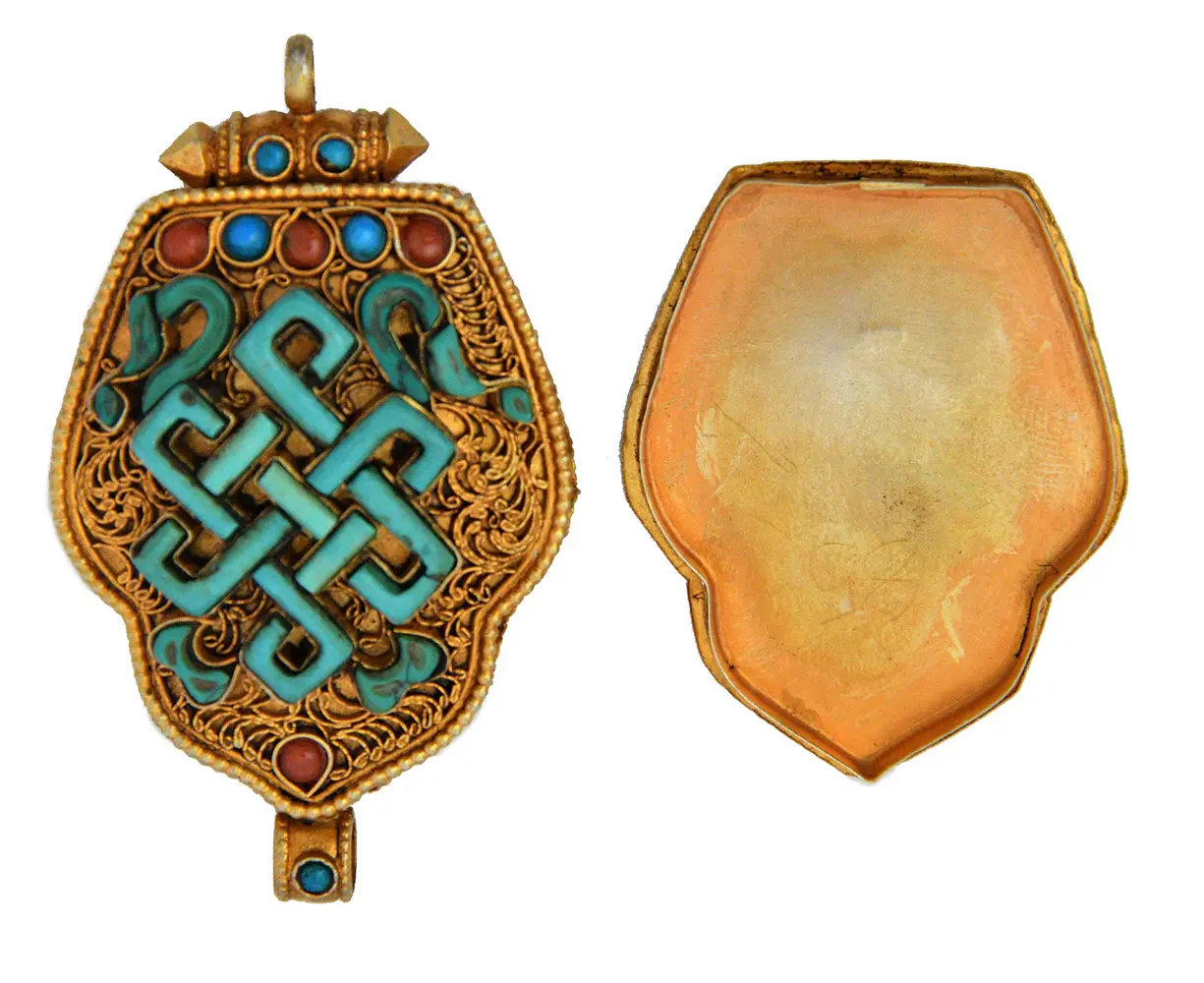The endless knot, or *Shrivatsa*, is one of the Eight Auspicious Symbols in Tibetan Buddhism, representing the interconnectedness of all things, the Buddha's infinite wisdom and compassion, and the cyclical nature of existence. Gau boxes, traditionally, are small reliquaries that hold sacred texts or images, and this piece captures that protective essence in a wearable form. Owning this pendant connects you to a rich cultural heritage and profound spiritual philosophy.