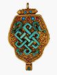 The heart of this piece features a striking, stylized endless knot rendered in vibrant turquoise, symbolizing the Buddha's eternal teachings. This central motif is beautifully complemented by accent stones of precious coral and smaller turquoise cabochons, offering a captivating contrast. The entire composition measures approximately 2.1 inches in height and 1.4 inches in width, a substantial yet elegant size that commands attention.