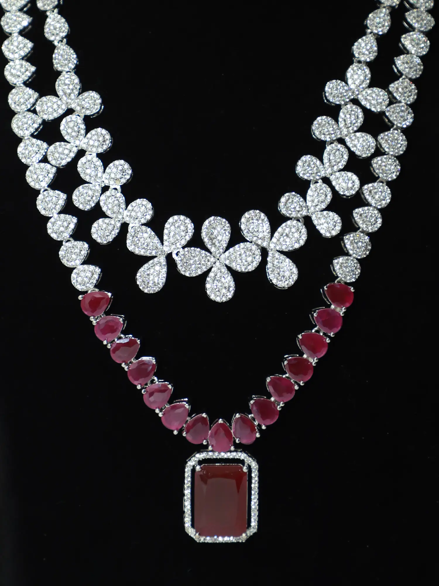 Exquisite Floral Design Two Layered American Diamond Necklace Set With Earrings