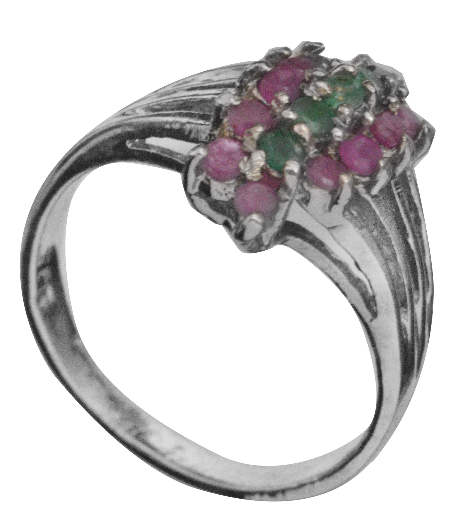 The captivating centerpiece features a delightful arrangement of vibrant green emeralds interspersed with deep, passionate rubies. These precious gems, set within a rich sterling silver gallery, form a floral-inspired motif that draws the eye. The band itself is sculpted with subtle, elegant lines that enhance the overall graceful profile, with a total height of 11 mm at its apex, creating a pleasing visual dimension without being overpowering.
