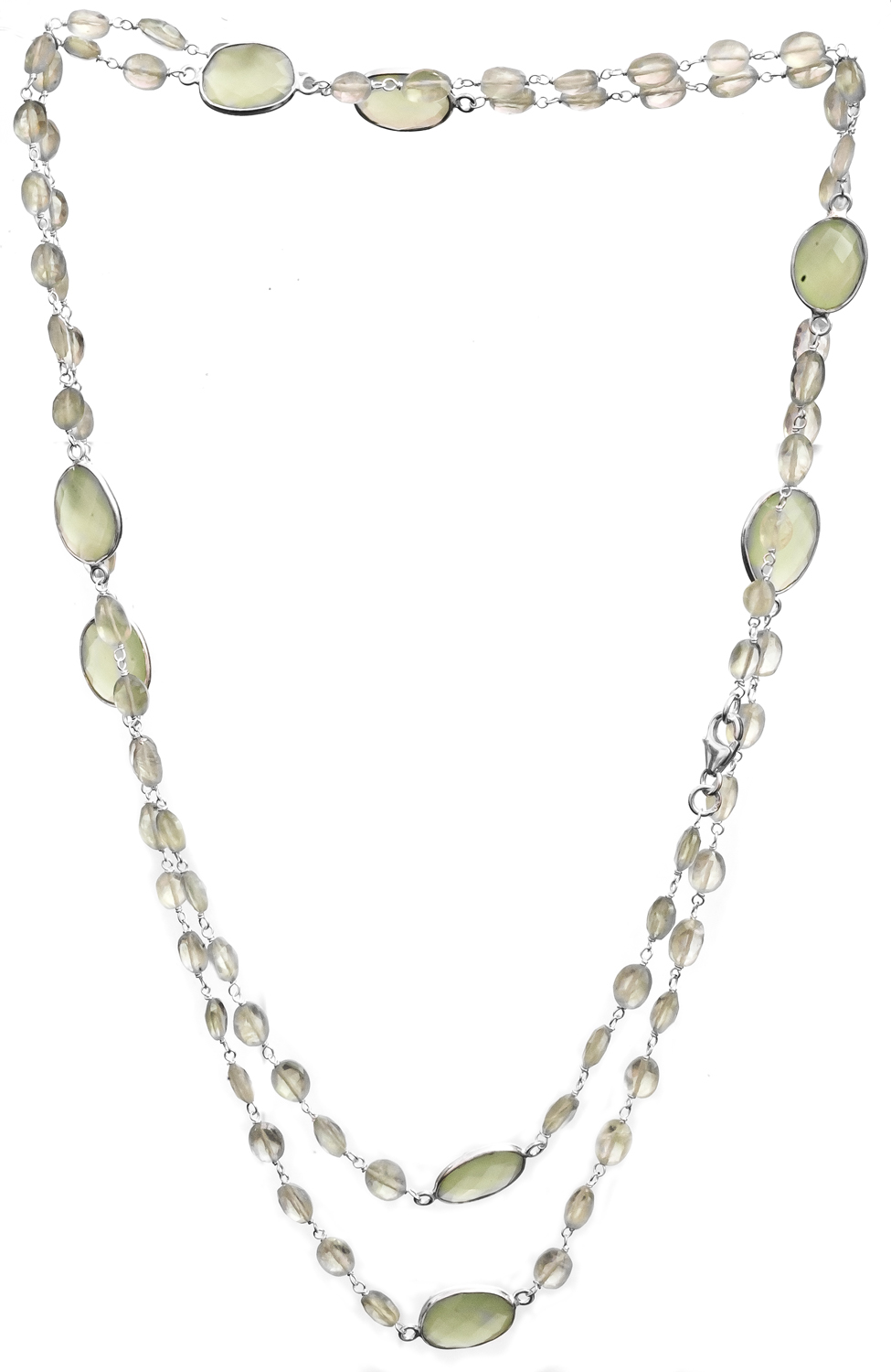 The forty-one and a half inches of this necklace are strung with an exquisite alternating pattern of smooth, polished beads and captivating, oval-cut gemstones. You'll appreciate the way the light plays across the multifaceted surfaces, highlighting the natural clarity and ethereal glow of the chalcedony and prehnite. The cool, refined sheen of the sterling silver chain provides a perfect complement, allowing the gemstones to truly shine.