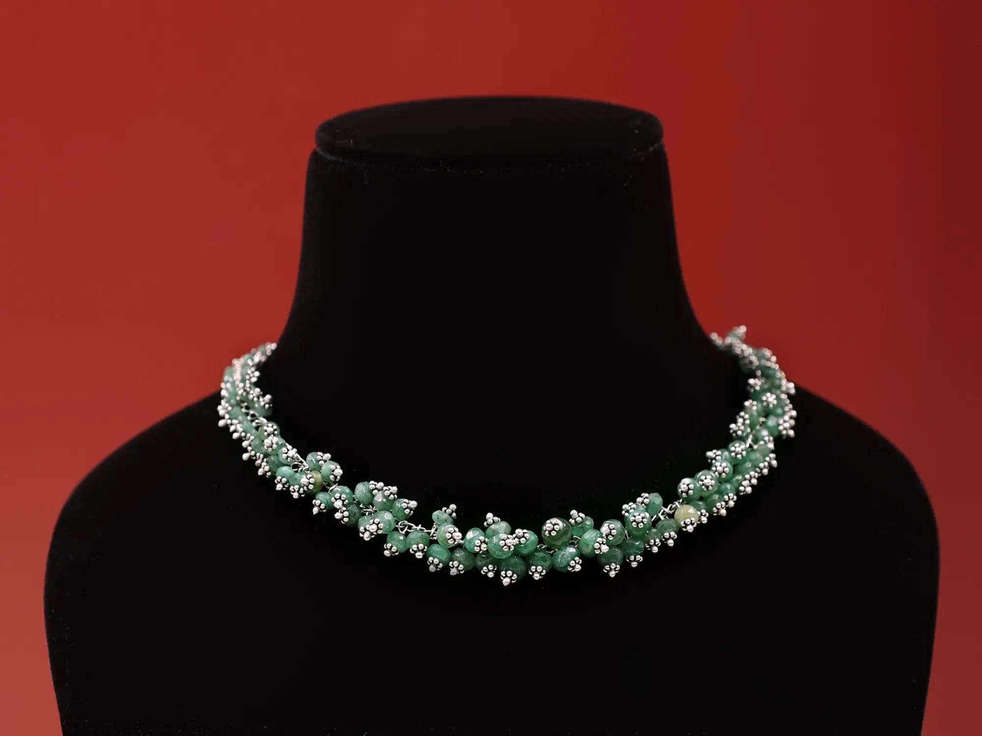 Elevate your ensemble with our Faceted Green Onyx Choker Necklace & Earring with Bracelet Set. The faceted green onyx stones create a stunning play of light, adding a touch of sophistication to the choker necklace and earrings. The coordinating bracelet completes the set, ensuring a cohesive and elegant look. The deep green hues of the onyx stones evoke a sense of timeless charm and versatility.