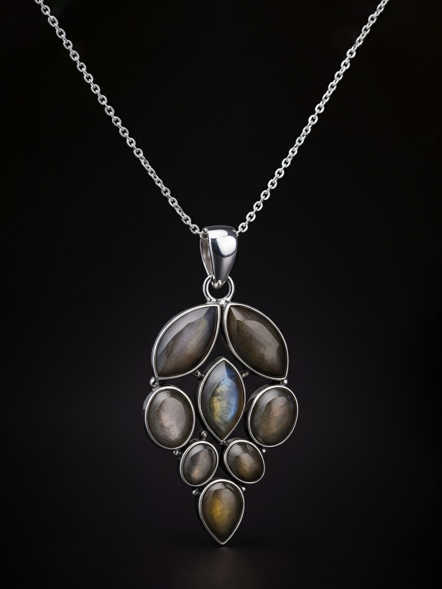 Here in the pendant, the stones are arranged like an inverted flower bud. The small pieces of stones are encased inside the silver frame. Whether worn for its aesthetic charm or spiritual significance, the Faceted Labradorite Pendant is a timeless accessory that carries the enchanting energy and ethereal beauty of the labradorite crystal.