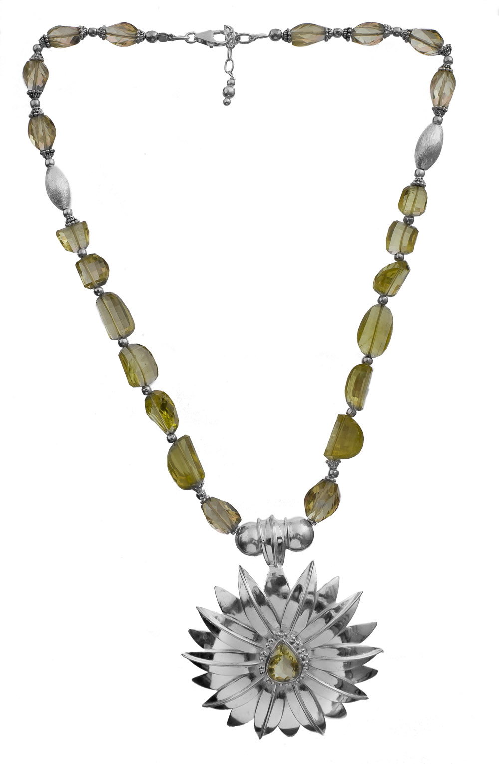 The design features a striking pendant, reminiscent of a blooming sunflower, crafted from polished sterling silver, encircling a luminous lemon topaz. This central motif is gracefully suspended from a strand of similarly hued, hand-faceted lemon topaz stones, interspersed with textured sterling silver beads that add depth and visual interest. The overall length, extending to 19 inches, ensures a flattering drape, resting perfectly at the décolletage. You'll find the interplay of light on the faceted stones and the polished silver creates a mesmerizing effect.