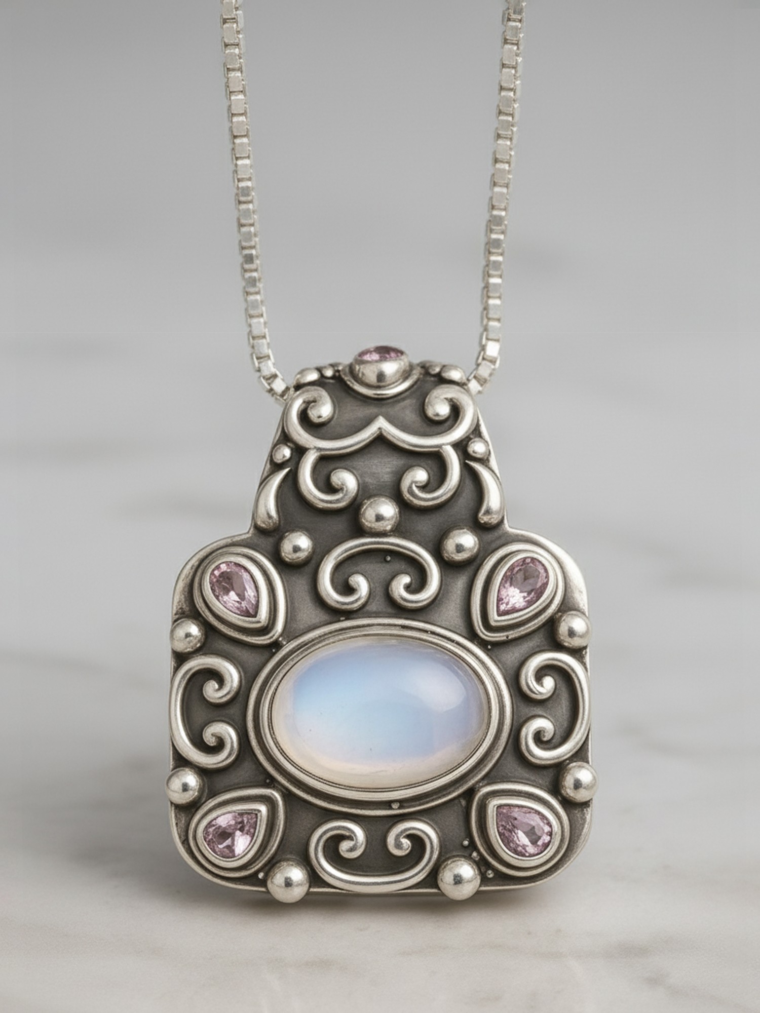 At first glance, it is easy to overlook this pendant. However, upon closer examination, you will realize this pendant grows on you. Whether it's the unique shaped, or the understated colours of rainbow moonstone and amethyst, we have many customers giving feedback on the number of compliments they have gotten for this pendant. The simplistic design is classy and easy to match with different outfits. It measures 2 inch in height, 1.4 inch in width, and weighs 27.2 grams.