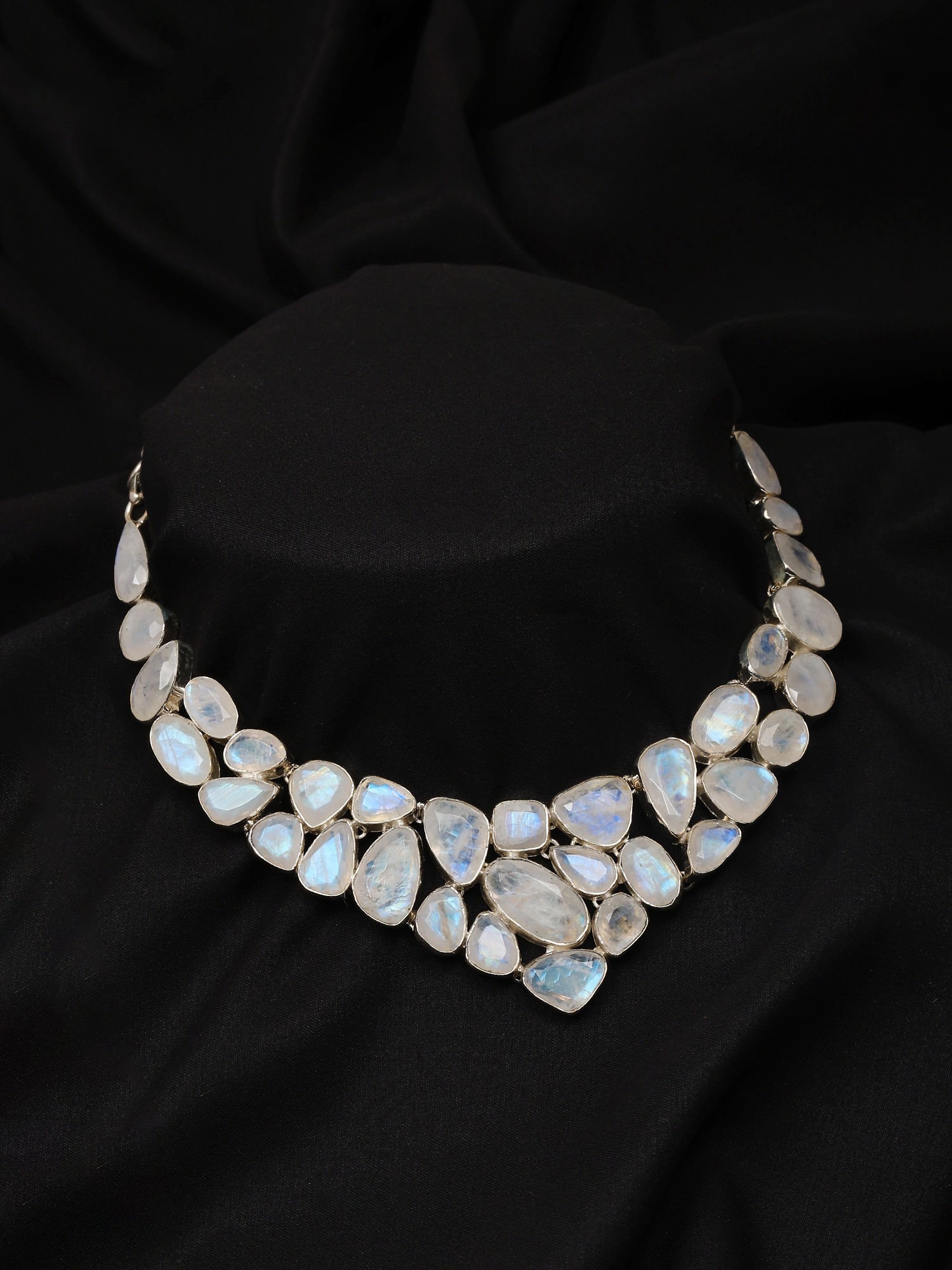 This necklace is more than just an accessory; it's a wearable piece of art that evokes a sense of wonder and enchantment. The gentle curve of the design beautifully drapes along the neckline, creating a focal point that is both striking and elegantly understated. Its generous cascade of rainbow moonstone makes it a perfect choice for those who aren't afraid to make a statement, yet its inherent grace ensures it will never feel overpowering. Whether you're dressing up a simple blouse or complementing a sophisticated evening gown, this necklace is guaranteed to draw admiring glances and spark conversations. Embrace the magic of moonstone and let this extraordinary piece illuminate your style.