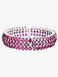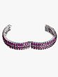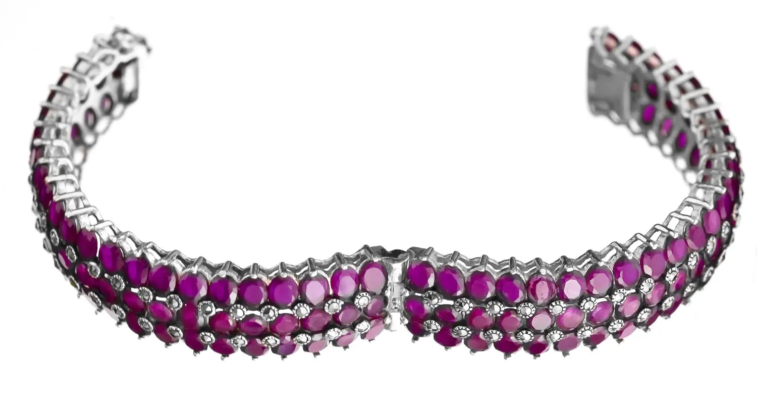 Adorn your wrist with a band of brilliant, faceted stones, approximately half an inch in width, that radiate a captivating magenta hue. These meticulously chosen gems are complemented by sparkling accents, adding a layer of dynamic shimmer. The generous 2.2-inch diameter ensures a comfortable yet striking presence, designed to draw the eye with its sophisticated symmetry and rich color palette.