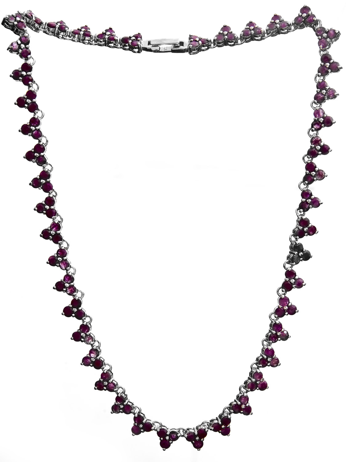 Feast your eyes upon the deep, mesmerizing crimson of numerous faceted stones, arranged to create a breathtaking visual spectacle. The delicate interplay of light and shadow across their surfaces brings a dynamic brilliance, making each glance a moment of pure delight. The graceful 17-inch length rests perfectly to accentuate the décolletage, designed for ultimate comfort and eye-catching appeal.
