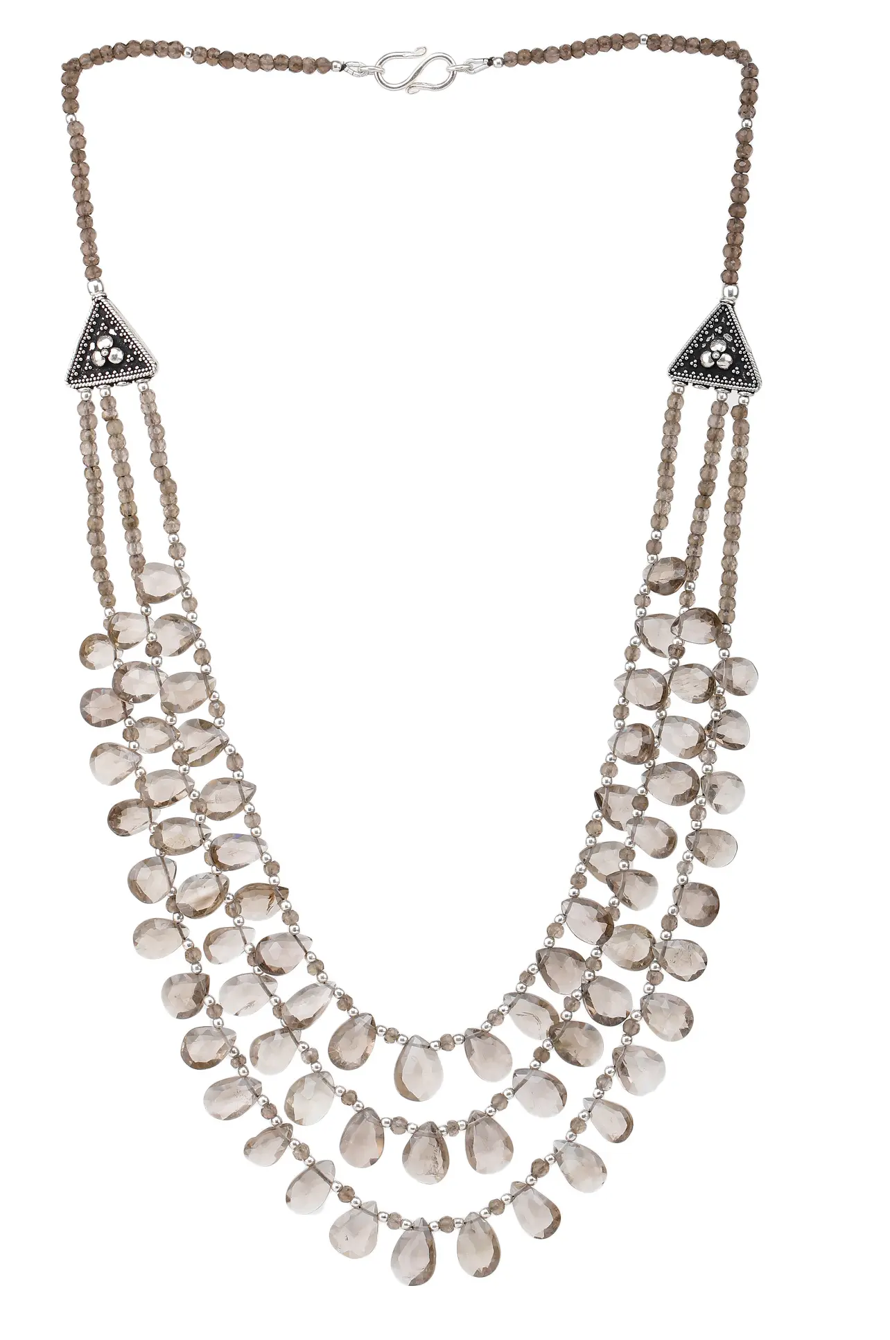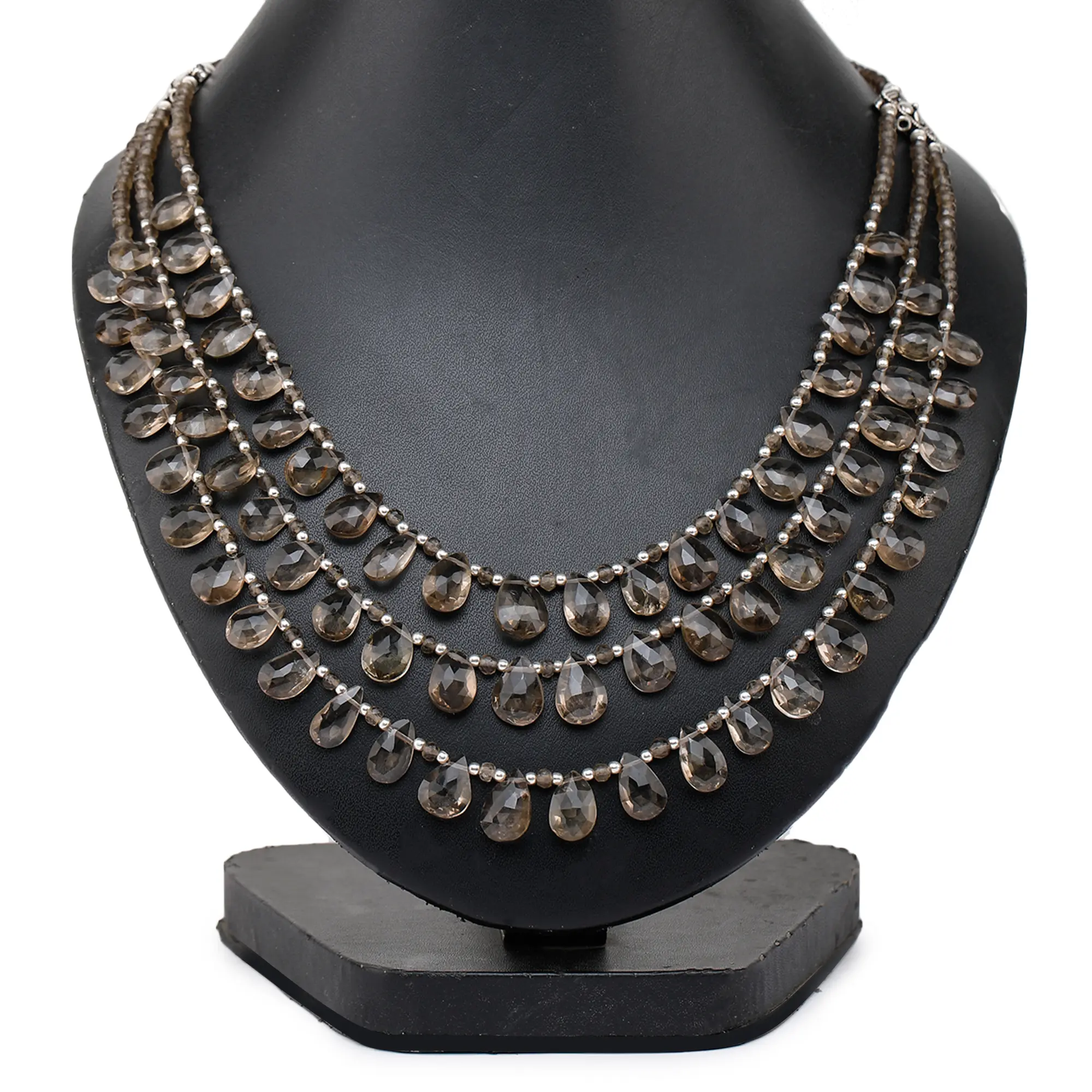 Discover a captivating statement piece that blends natural beauty with refined craftsmanship. This exquisite necklace features multiple strands of shimmering, faceted smoky quartz, each stone meticulously cut to catch the light and reveal its subtle, earthy tones. Suspended from delicate sterling silver chains, the teardrop-shaped quartz beads create a cascade of soft, warm hues, reminiscent of a serene twilight sky.