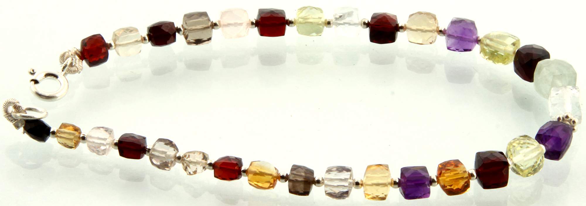 Behold a curated collection of vibrant gemstones, including the rich intensity of garnet, the subtle clarity of crystal, the earthy tones of smoky quartz, the delicate blush of prehnite, and the refreshing vibrancy of green amethyst. These stones are presented in a faceted square shape, a modern yet timeless silhouette that allows each gem to showcase its unique character. The ensemble is completed with a secure and elegantly designed sterling silver clasp, a testament to thoughtful detail. This bracelet measures a versatile 7.5 inches, offering a comfortable and flattering fit for most wrists.