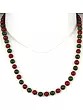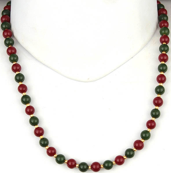 Experience the striking contrast of deep crimson and verdant green, beautifully punctuated by subtle gold-toned accents between each bead. This alternating pattern creates a mesmerizing visual rhythm, drawing the eye and adding a touch of opulence. Measuring sixteen inches in length, it rests perfectly at the collarbone, drawing attention to your décolletage with refined elegance.