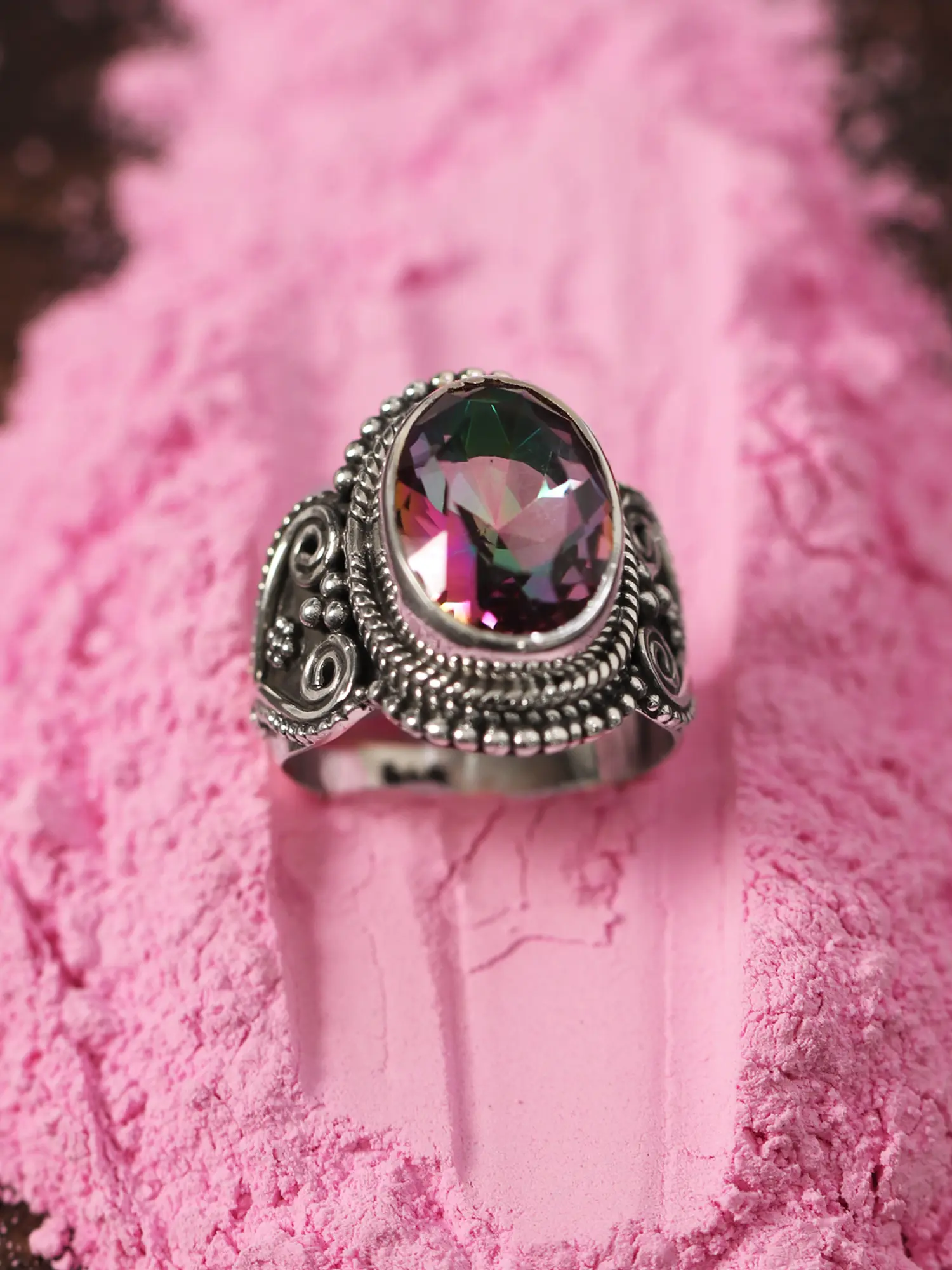 The mystic topaz, centerpiece of this sterling silver ring, is a stone of allure and vitality. It is said that this gemstone is imbued with properties that bolster one's self-confidence and encourages the nurturing of inner wisdom. With its kaleidoscope of colors, the mystic topaz is a marvel, reflecting a spectrum of deep purples and vibrant greens, reminiscent of a twilight sky. It is not only known for its captivating appearance but also for its purported ability to inspire creativity and assist in manifesting one's intentions.