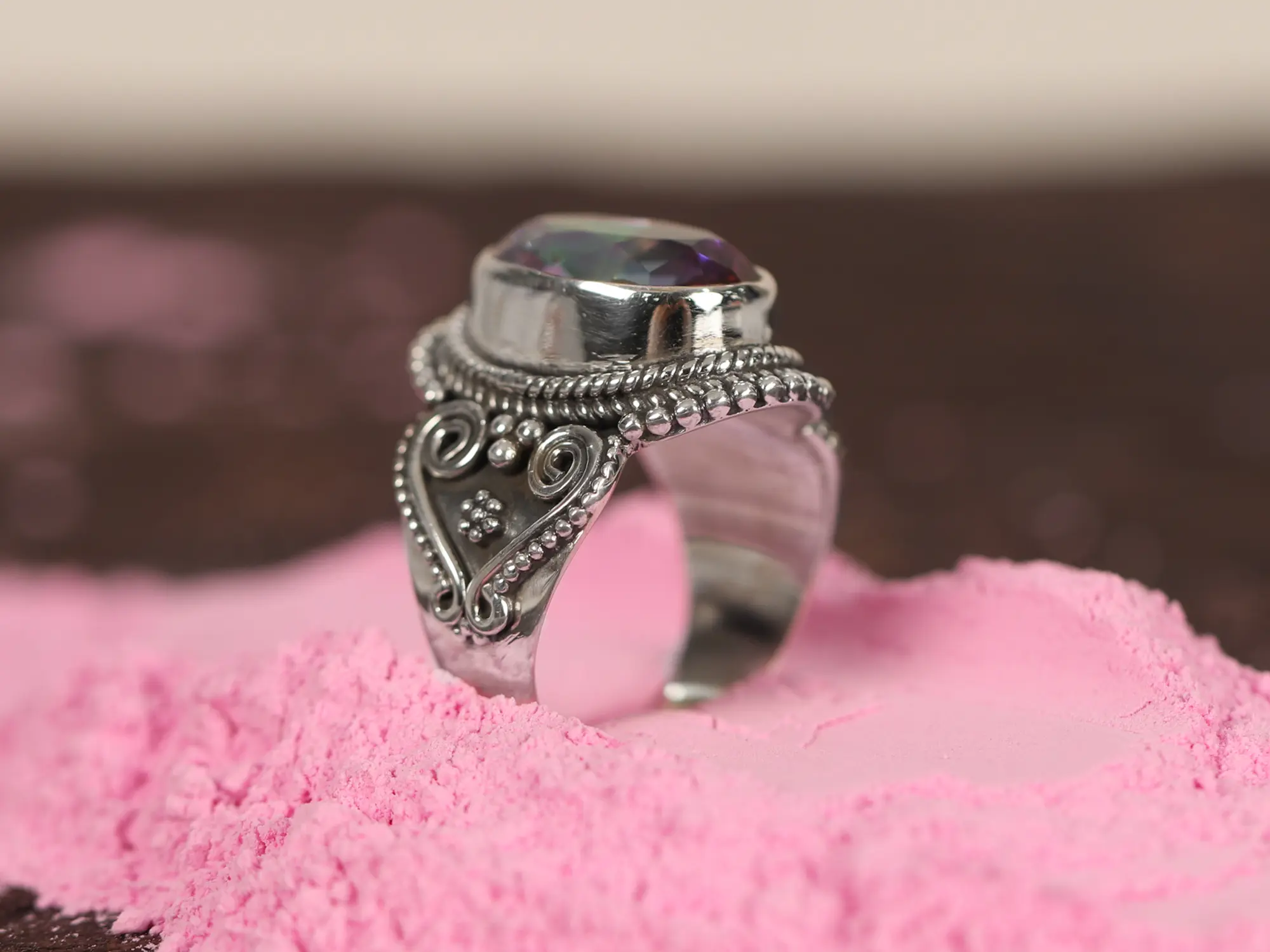 The fine silver pattern surrounding the mystic topaz is crafted to complement its enchantment, adding an element of intricate beauty. This ring, a symphony of craftsmanship and nature's art, is more than an ornament- it's a talisman for those seeking to intertwine the magic of the earth with the milestones of their journey.