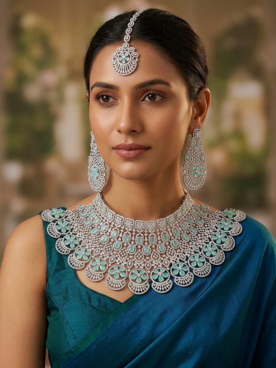 This style draws inspiration from classic bridal adornments, celebrating a rich heritage of celebratory jewelry. The floral motifs and the generous use of brilliant stones are reminiscent of pieces passed down through generations, imbued with stories and significance. Wearing this set connects you to a lineage of celebratory splendor, adding a layer of profound meaning to your personal style.
