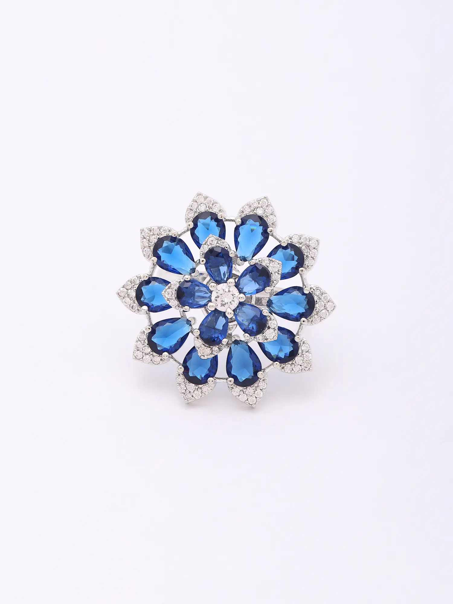 The design unfolds like a mesmerizing bloom, featuring gracefully sculpted petals that encircle a central cluster of shimmering accents. Pear-shaped, sapphire-blue stones are artfully arranged, their facets catching and refracting light with every movement, creating a dazzling display. Complementing these are smaller, clear American diamonds that add an extra layer of sparkle, enhancing the overall brilliance and sophistication. The substantial yet comfortable presence, measuring approximately 1.1 inches in height and 1.2 inches in width, makes it a striking focal point.
