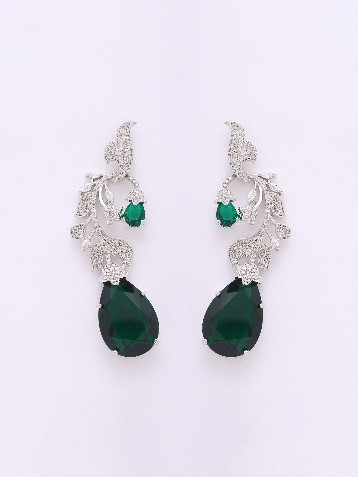 These striking creations boast a length of 2.2 inches and a width of 0.75 inches, offering a perfectly balanced silhouette that drapes gracefully. The design features a central floral spray, generously encrusted with sparkling stones, leading to a teardrop-shaped, deep green gemstone. This vibrant stone captures the essence of emeralds, radiating a rich, captivating hue that complements the dazzling sparkle of the surrounding diamonds.