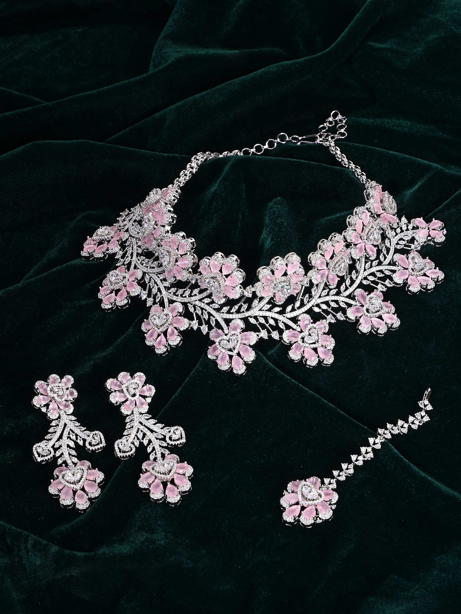 Floral Design American Diamond Necklace Set & Maang Tikka