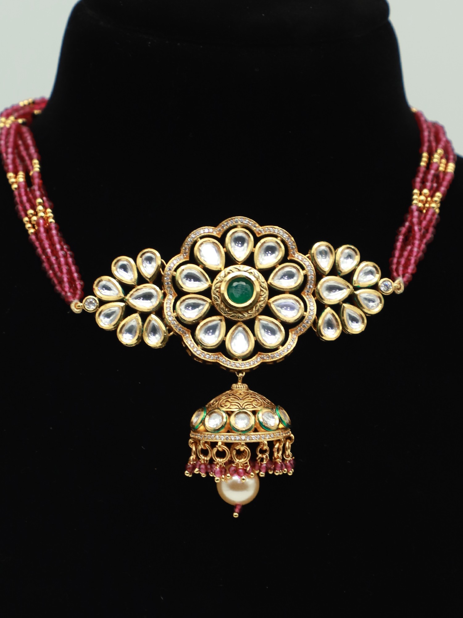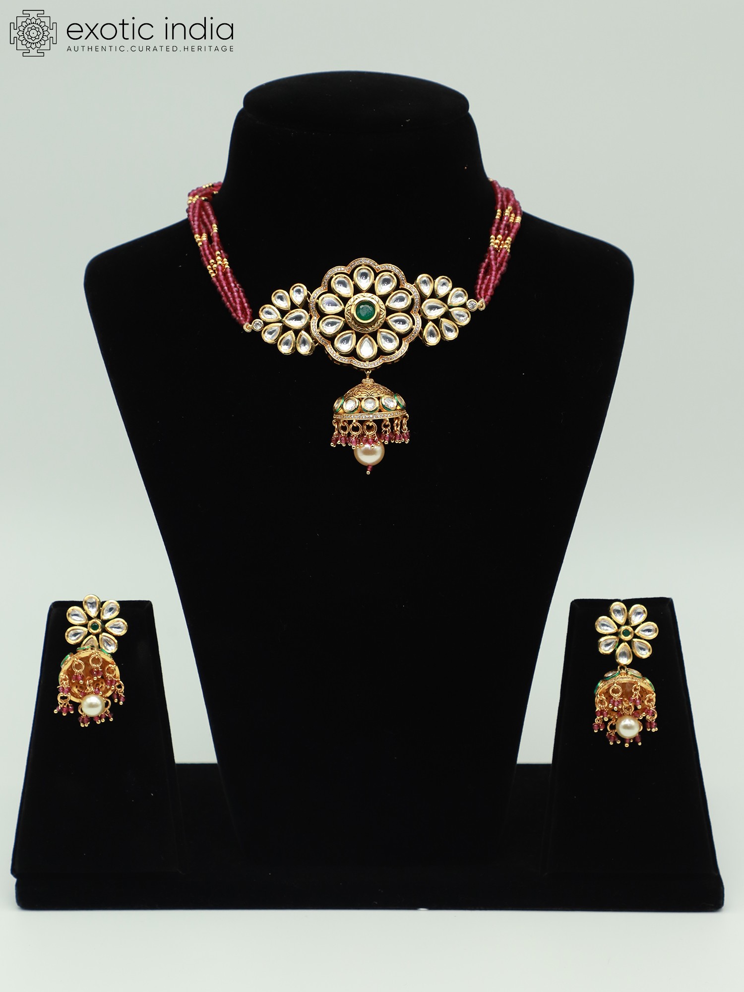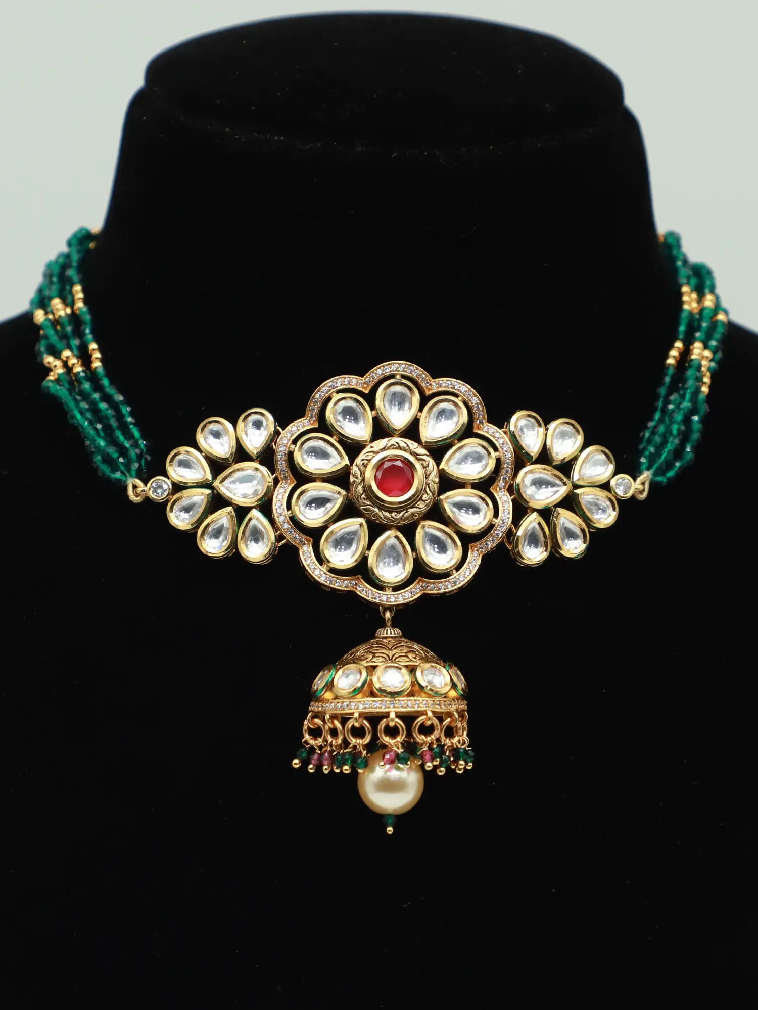 Immerse yourself in the timeless allure of traditional Indian jewelry with this exquisite choker set. This ensemble isn't just an accessory; it's a statement piece, a conversation starter, and a reflection of your impeccable taste. Designed to capture the essence of classic beauty, this set elevates any attire, be it ethnic or contemporary, with its regal charm. The design draws inspiration from the rich heritage of Indian artistry. Each element is meticulously crafted, showcasing a keen attention to detail and a passion for preserving age-old techniques. The floral motif, a symbol of grace and femininity, is intricately woven throughout the necklace and earrings, creating a harmonious and captivating visual experience.