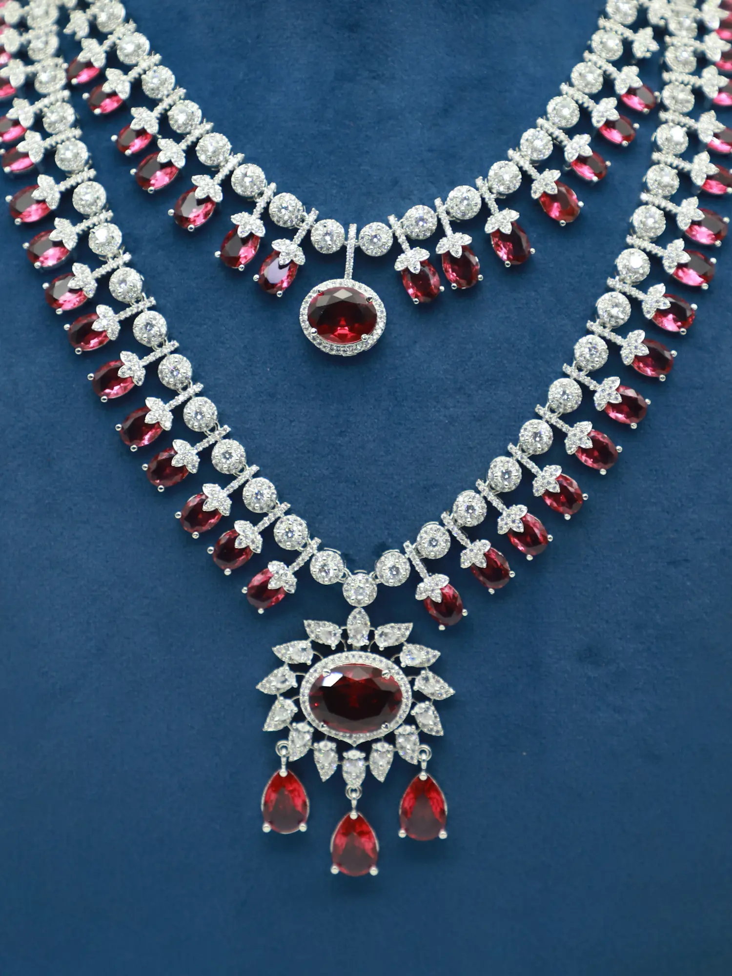 The necklace features a double-layered design, adding depth and dimension to the overall aesthetic. Each layer is adorned with intricately placed American diamonds, creating a seamless flow of sparkle. The floral motifs are delicate yet striking, adding a touch of femininity and grace. The attention to detail is evident in every facet, ensuring a piece that is both beautiful and durable. The coordinating earrings complement the necklace perfectly, featuring a similar floral design and the same dazzling American diamonds. Together, they create a harmonious and captivating set that is sure to become a treasured addition to your jewelry collection.