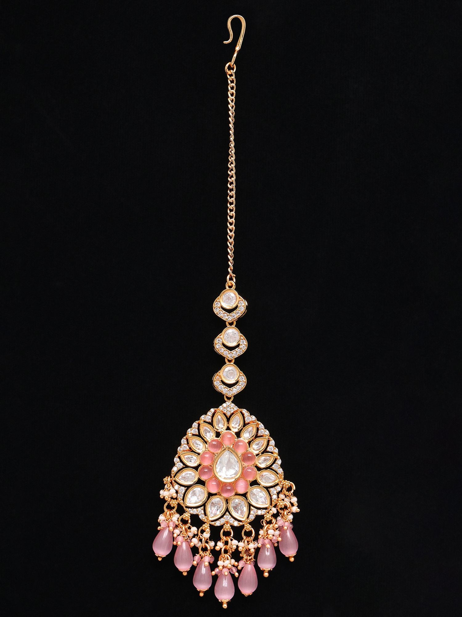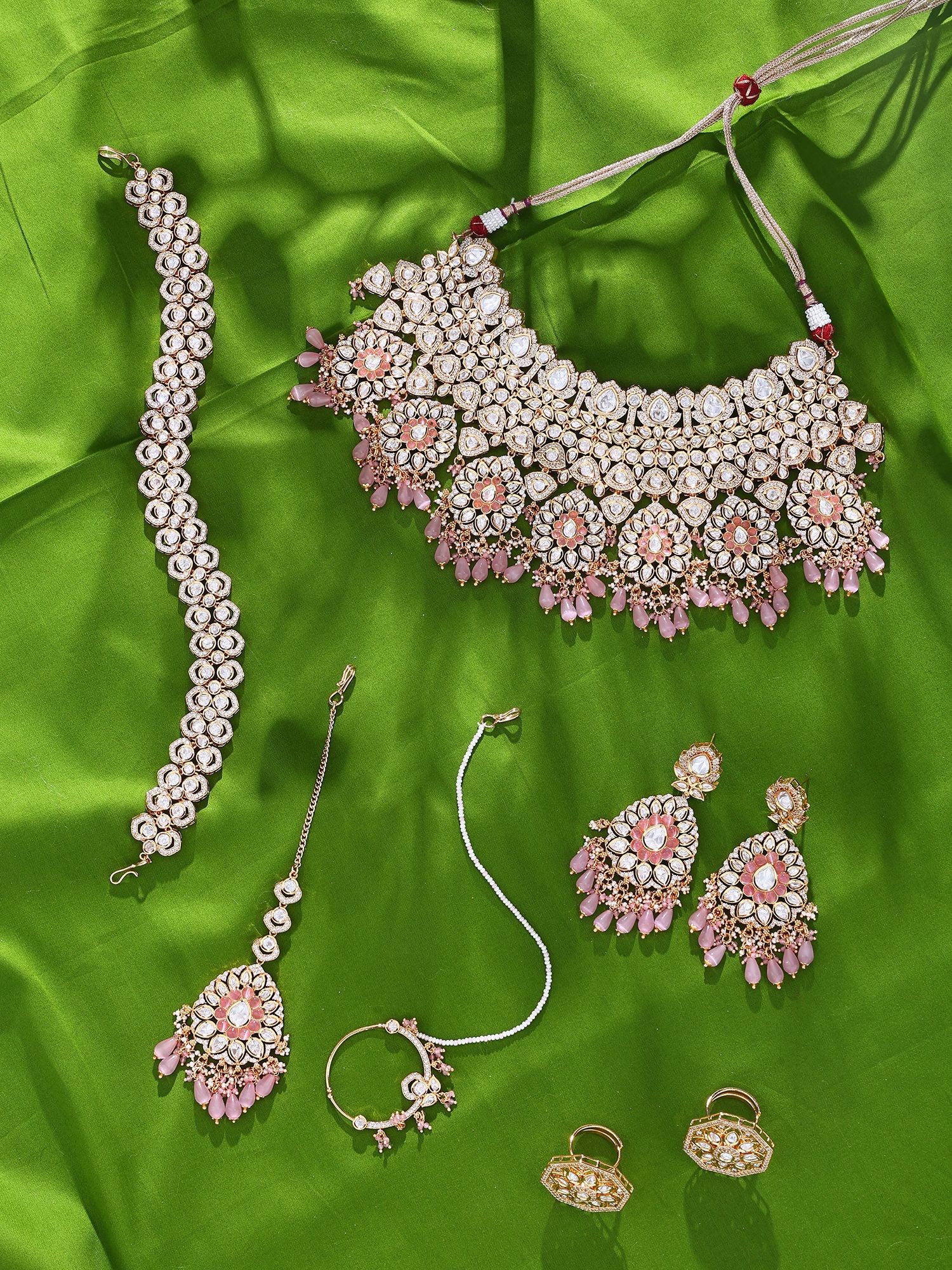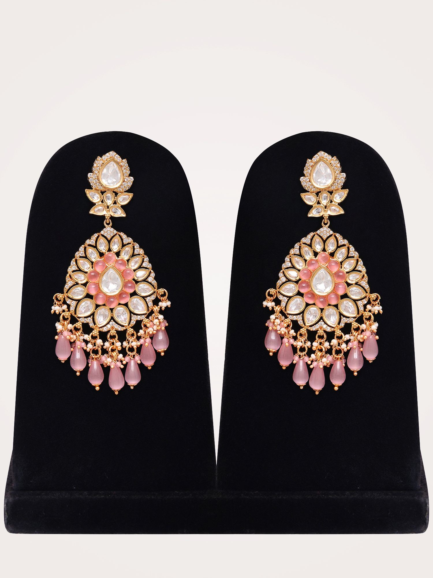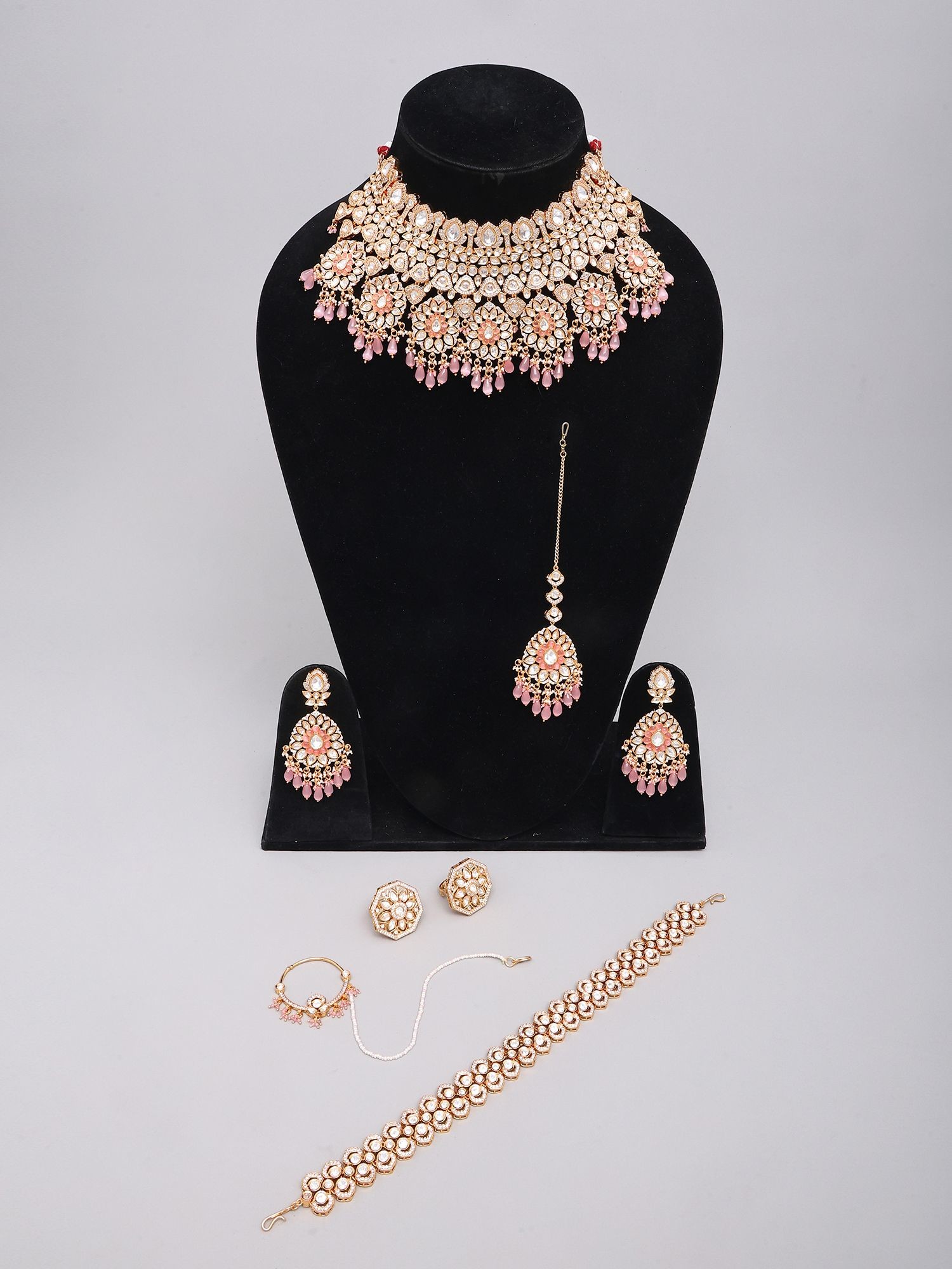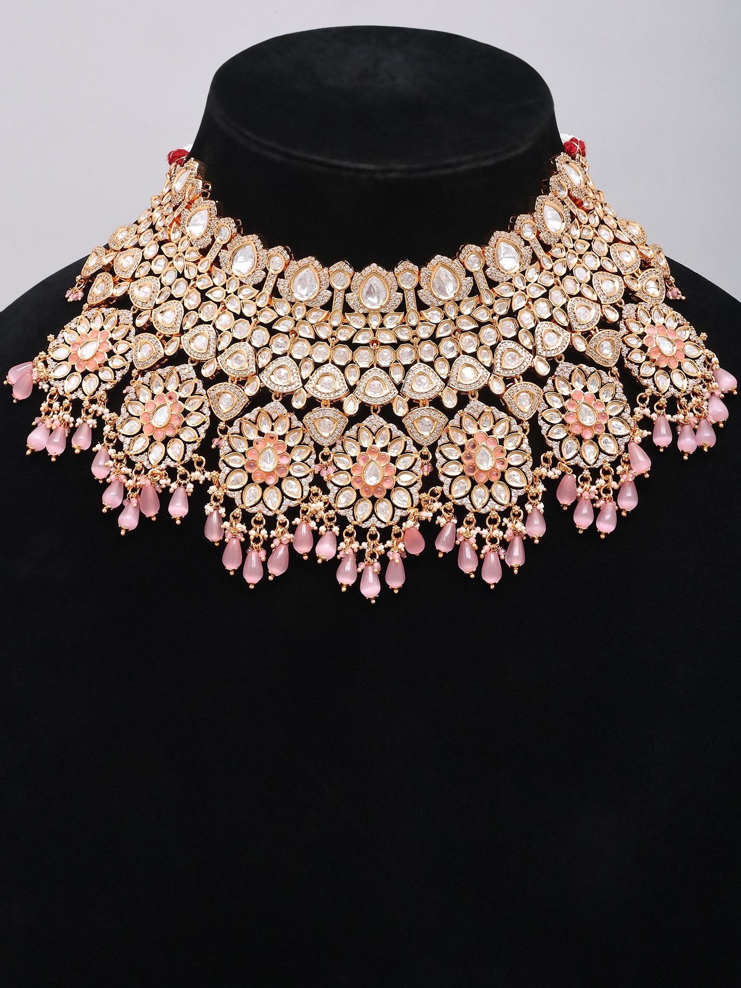 Floral Design Kundan Stone Studded Bridal Wedding Set with Pink Bead Drops