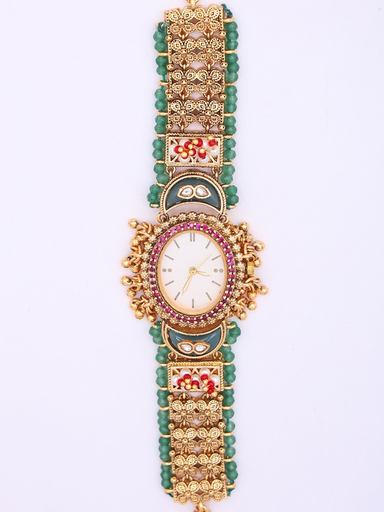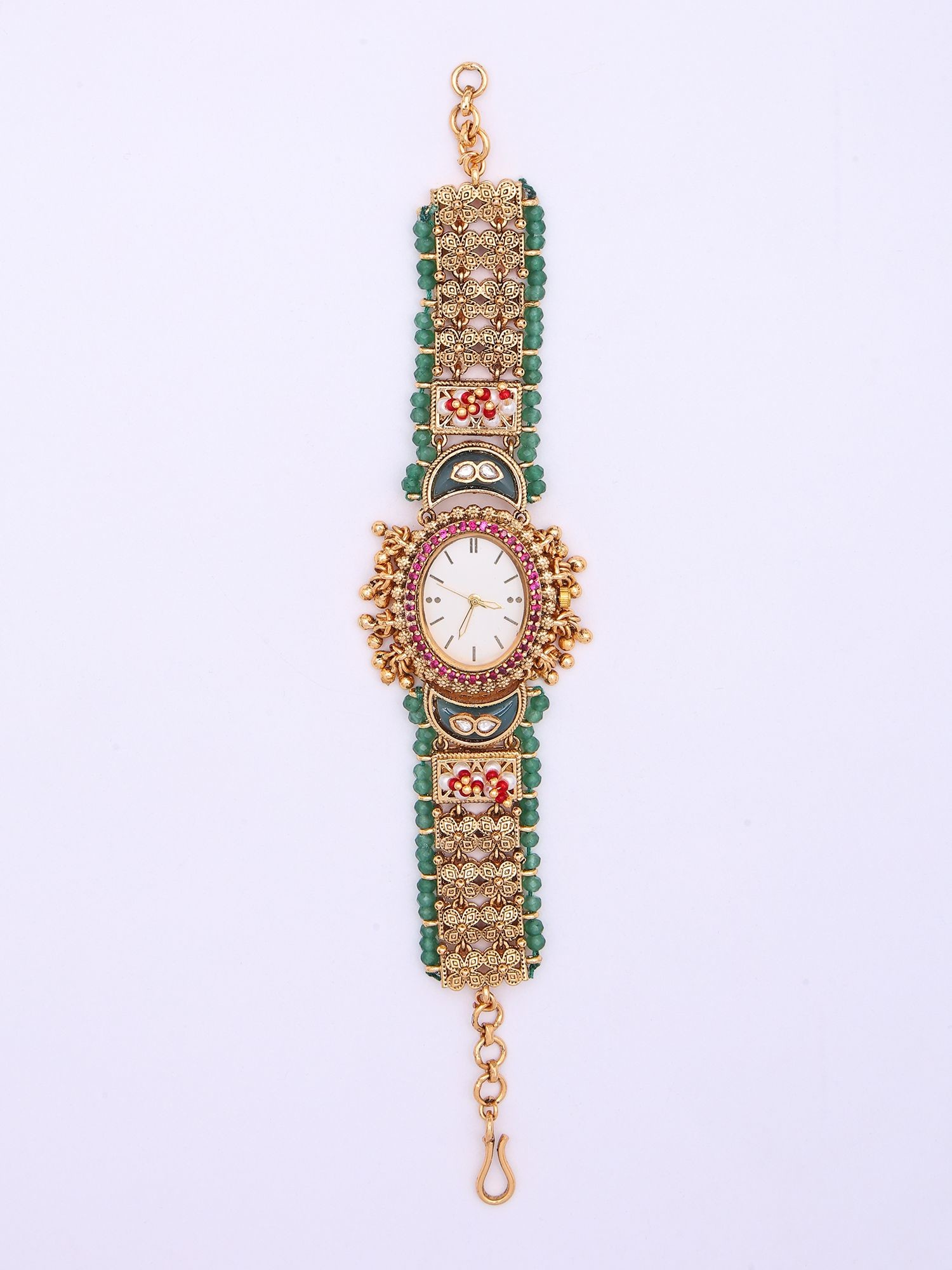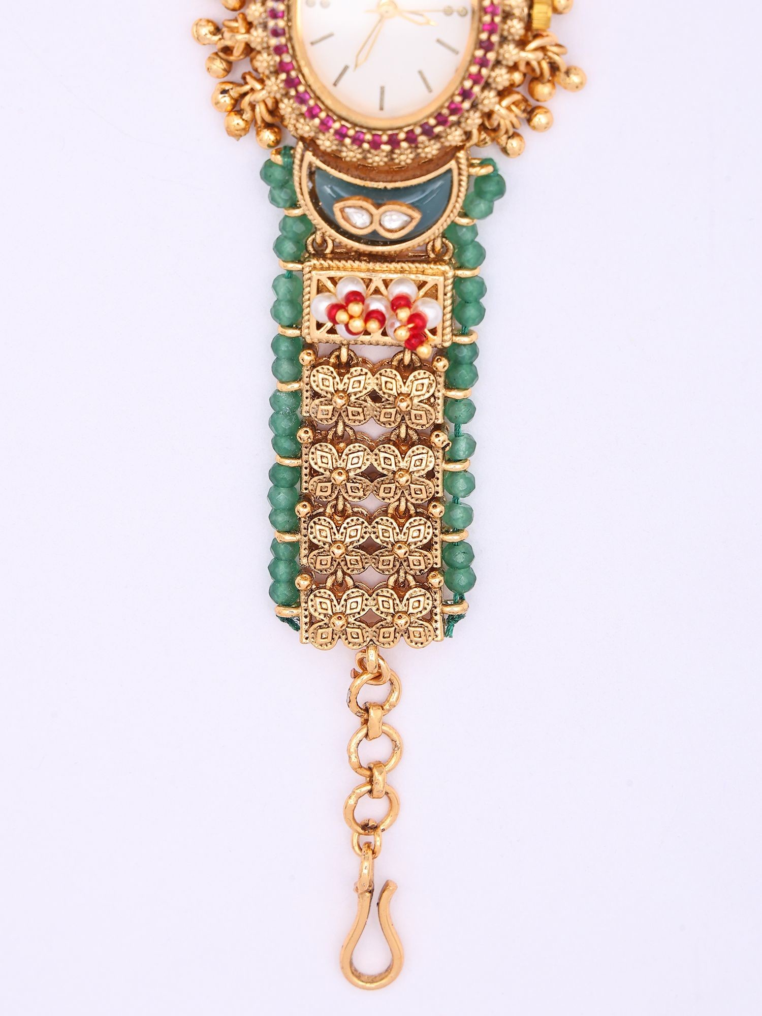 Adorned with sparkling Kundan stones and colorful bead embellishments.