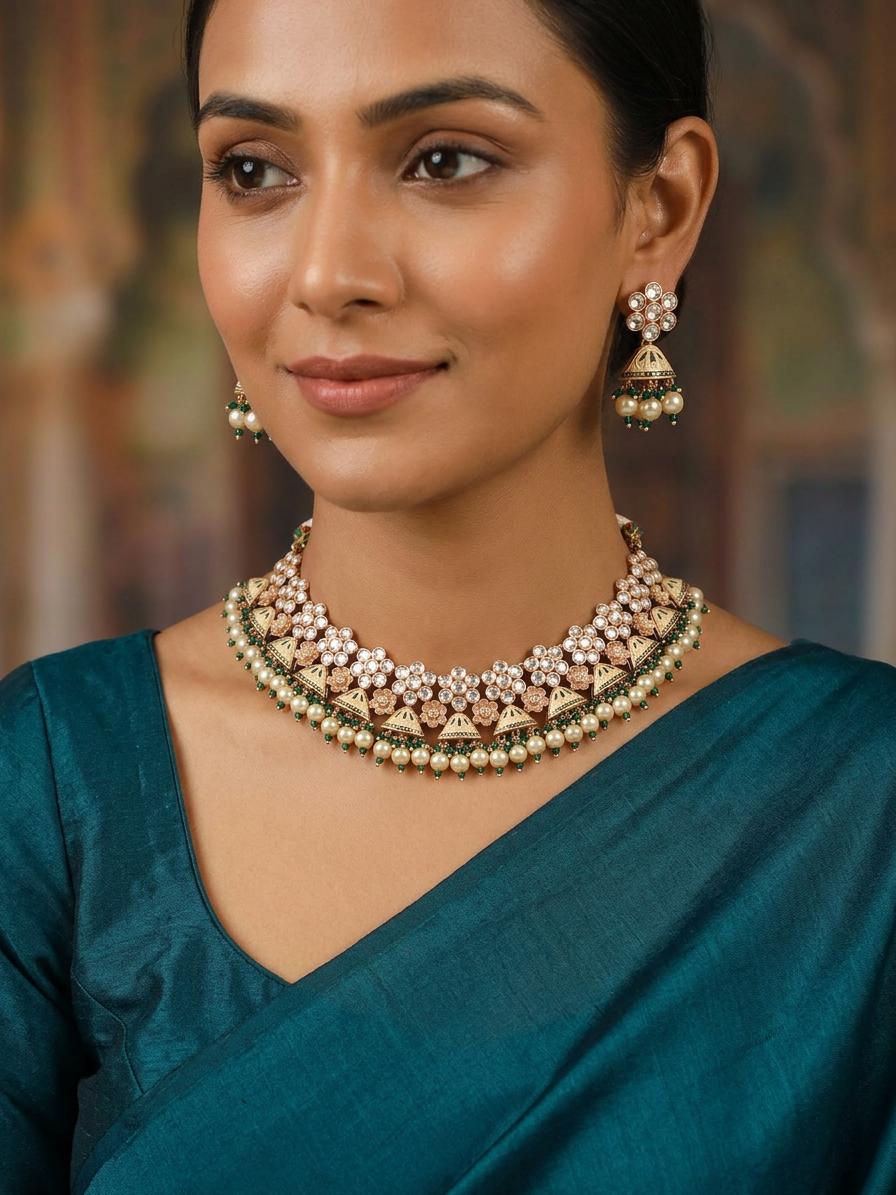 Indulge in the captivating allure of this exquisite necklace set, where traditional artistry meets contemporary style. Crafted from brass, this ensemble boasts intricate detailing and a mesmerizing floral design, making it a perfect adornment for special occasions and celebratory moments. The warm, rich tones of the brass provide a lustrous backdrop for the vibrant Meenakari work, creating a piece that is both eye-catching and deeply sophisticated. The necklace features a stunning array of meticulously crafted floral motifs, each one a testament to the skill and dedication of the artisans. The flowers are enhanced by the delicate Meenakari detailing, bringing a pop of color and depth to the design. The harmonious blend of colors and the floral pattern evokes a sense of natural beauty and timeless grace. The necklace is further embellished with strings of lustrous imitation pearls and subtle green beads, adding a touch of classic elegance and subtle sparkle. The cascading pearls and green beads offer a gentle sway, catching the light and creating a captivating visual effect.