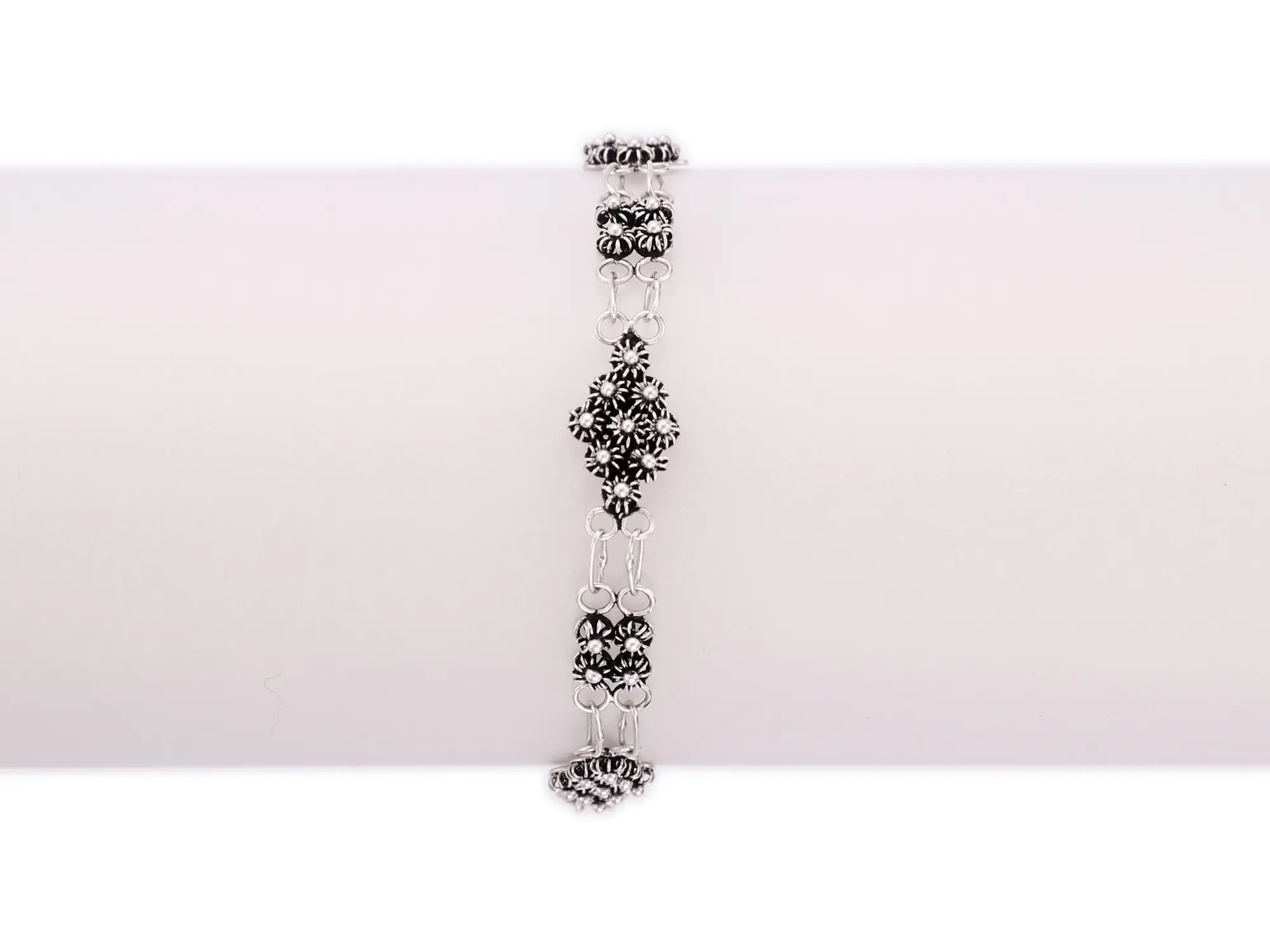 This exquisitely crafted bracelet features a delicate floral motif, perfect for adding a touch of understated elegance to any ensemble. Each floral element is meticulously rendered, capturing the intricate beauty of nature in gleaming sterling silver. The overall effect is both charming and sophisticated, making it a versatile piece that can be dressed up or down. The bracelet's fine details and elegant construction speak to a timeless appeal, ensuring that it will remain a treasured piece in your jewelry collection for years to come.
