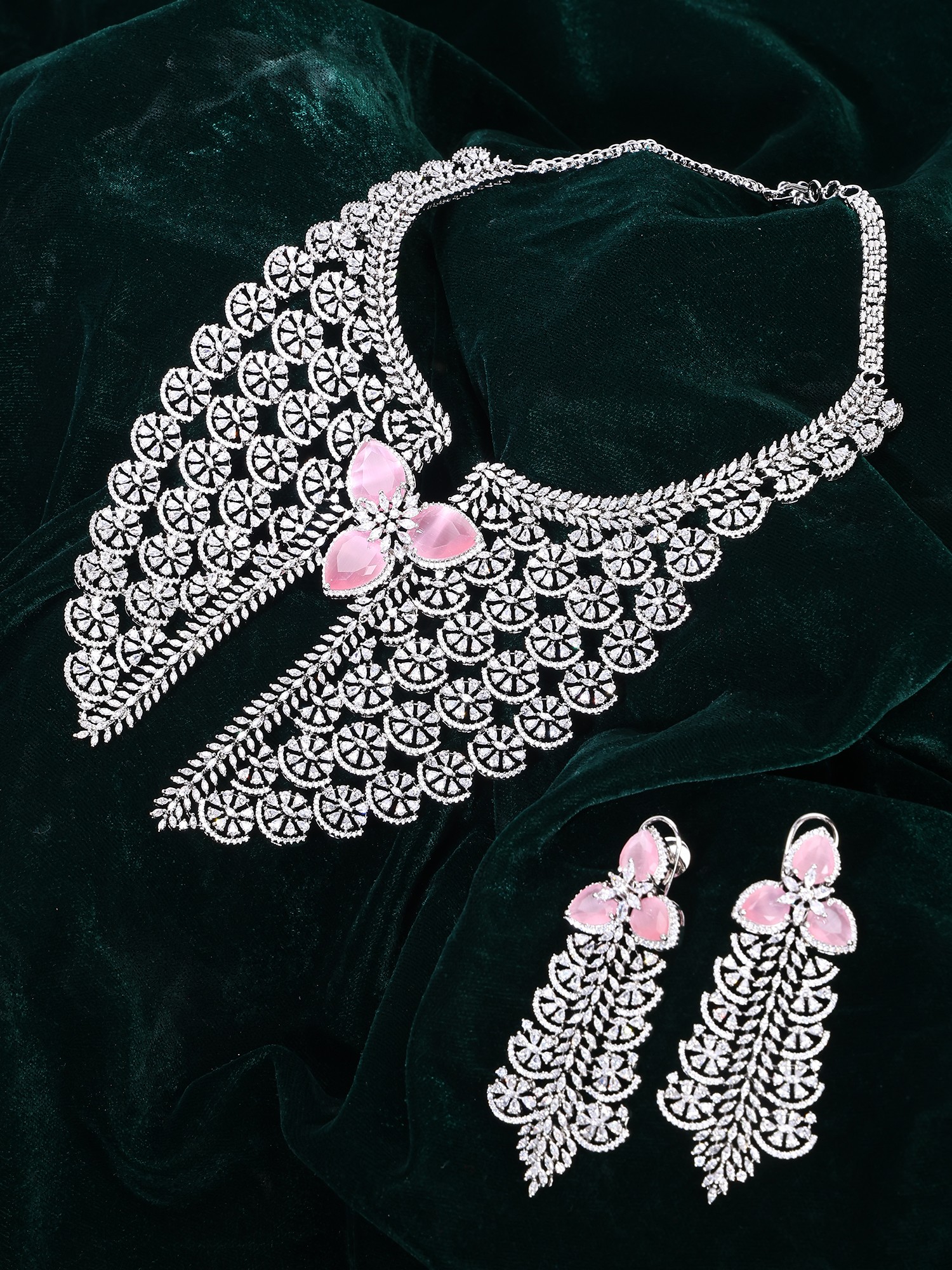 Green Crystal Floral American Diamond Wedding Necklace Set with Stud Earrings