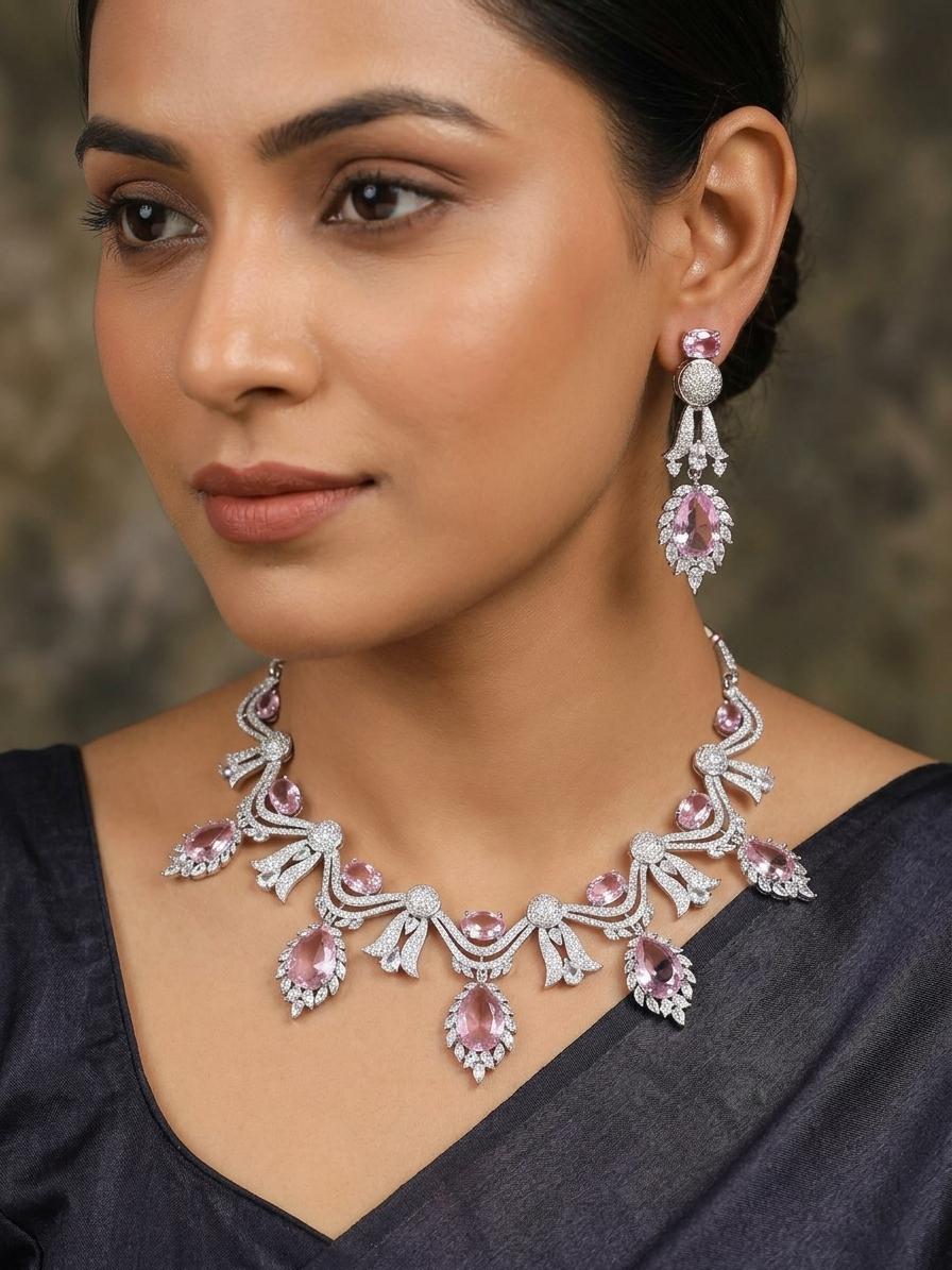 Stunning Stone Studded Embellished American Diamond Necklace Set With Earrings