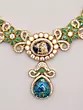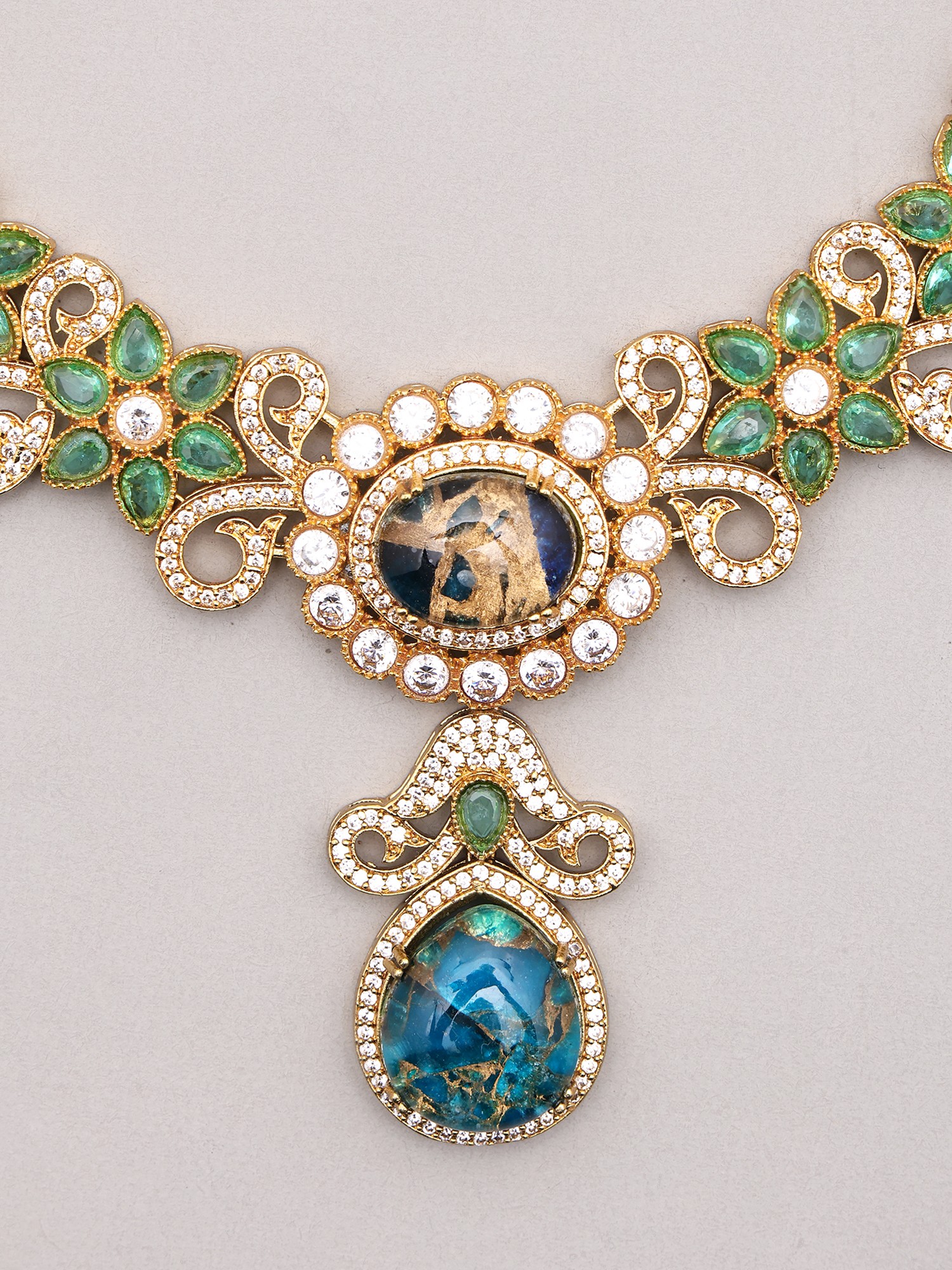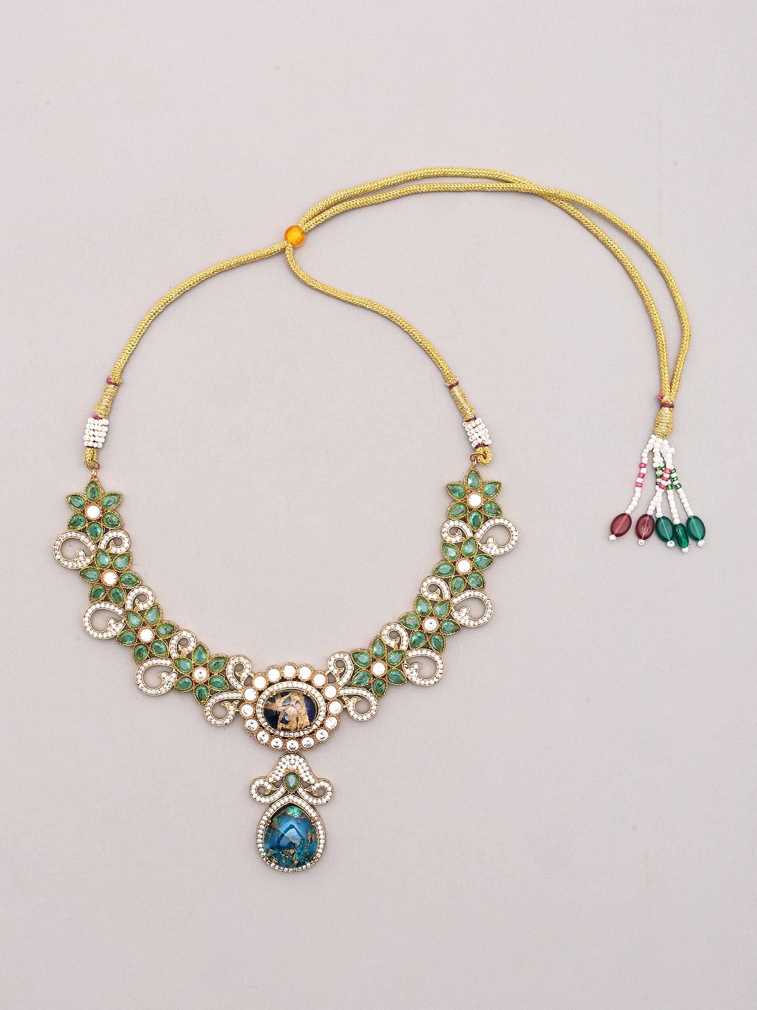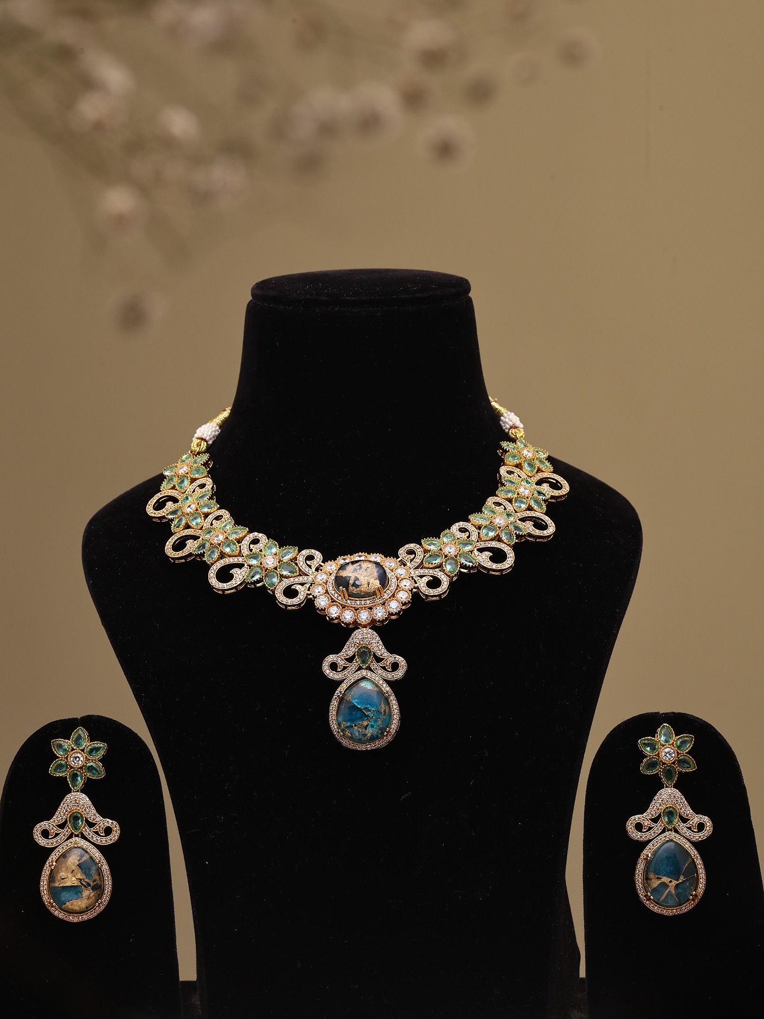 Unveil an aura of sophistication with this exquisite necklace set, a testament to timeless design and meticulous artistry. The centerpiece is a captivating pendant, suspended from a delicately crafted necklace, adorned with a mesmerizing blend of green and blue stones. Each element is thoughtfully arranged, mirroring the organic beauty of nature in a luxurious embrace.