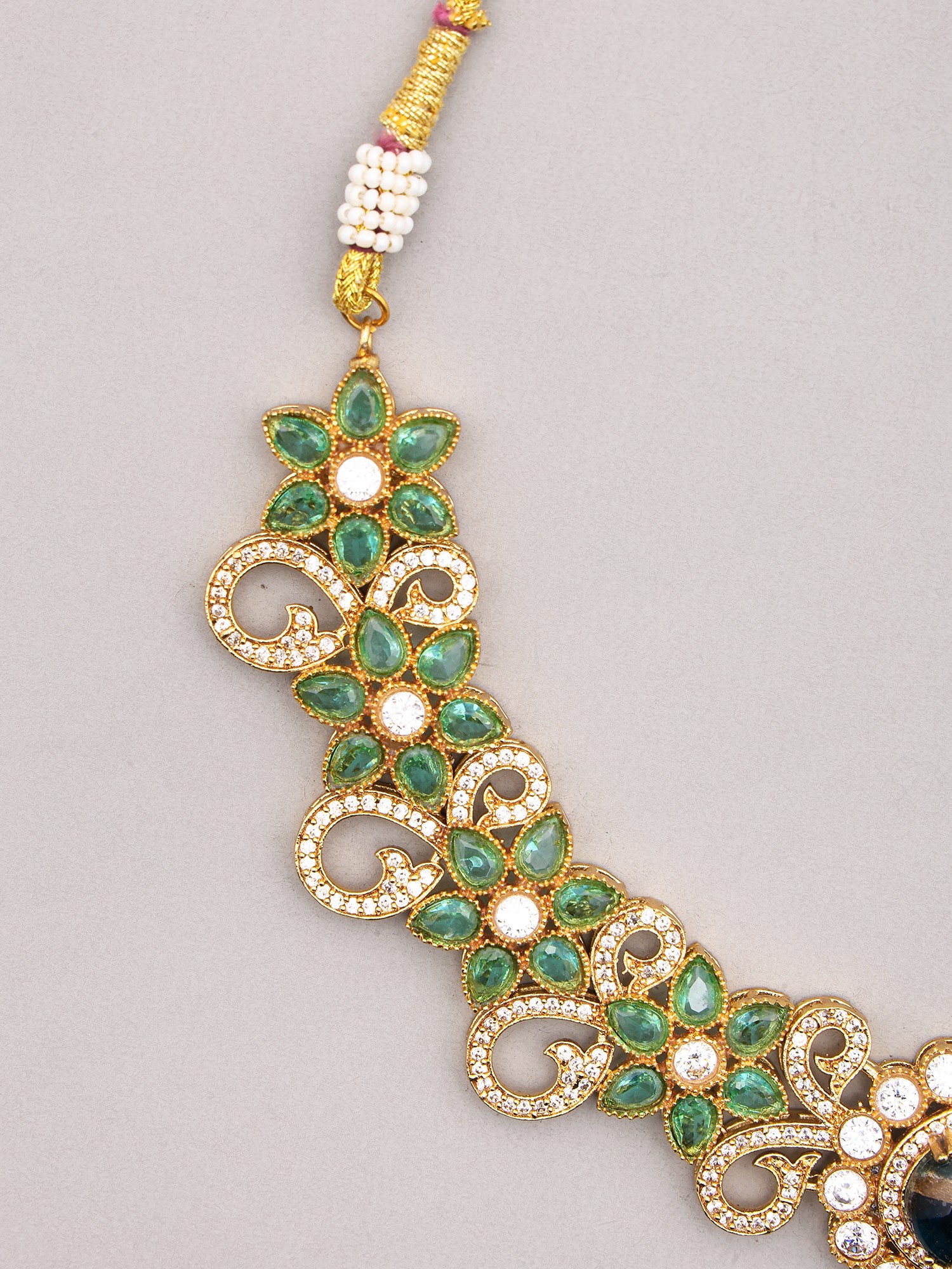 Floral Green and Blue Stone Studded Necklace Set with Earrings